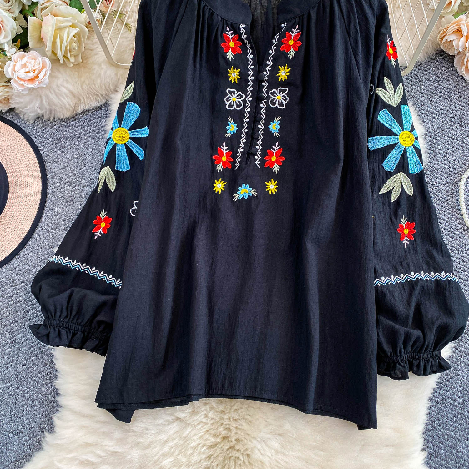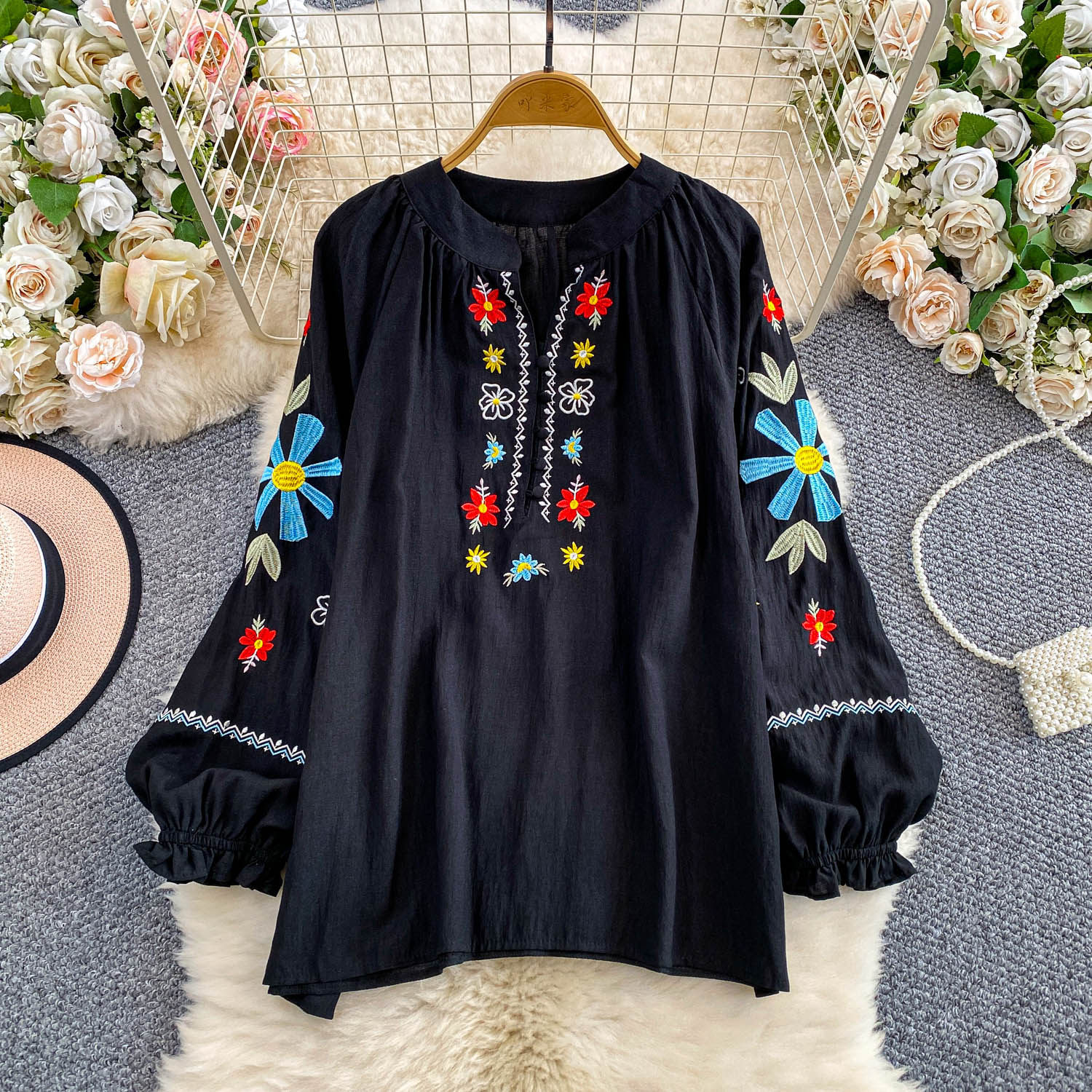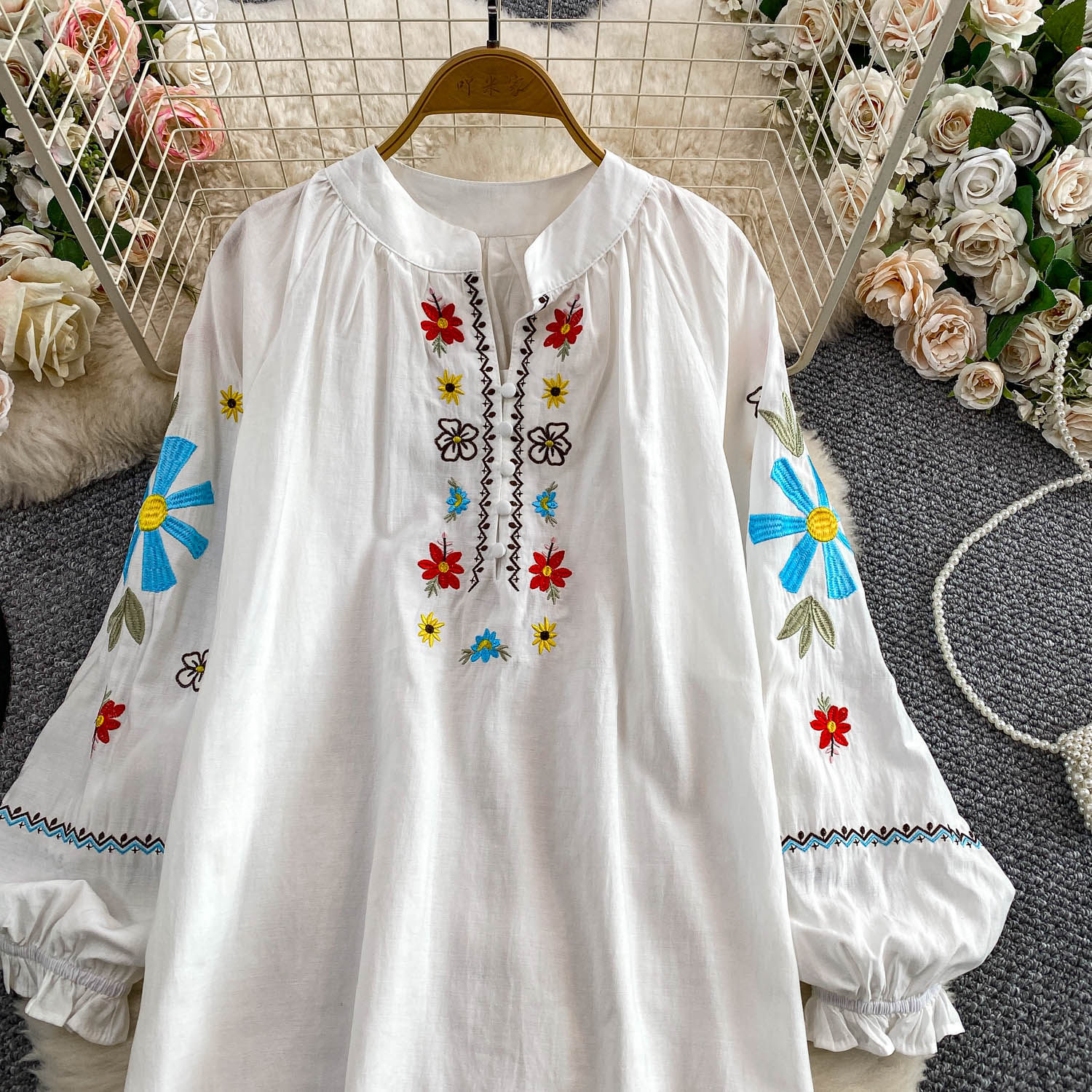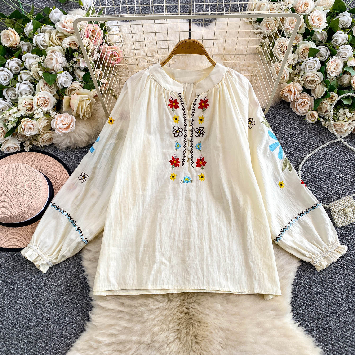 Sweet, Youth-Enhancing Floral Embroidery Stand Collar Puff Sleeve Shirt