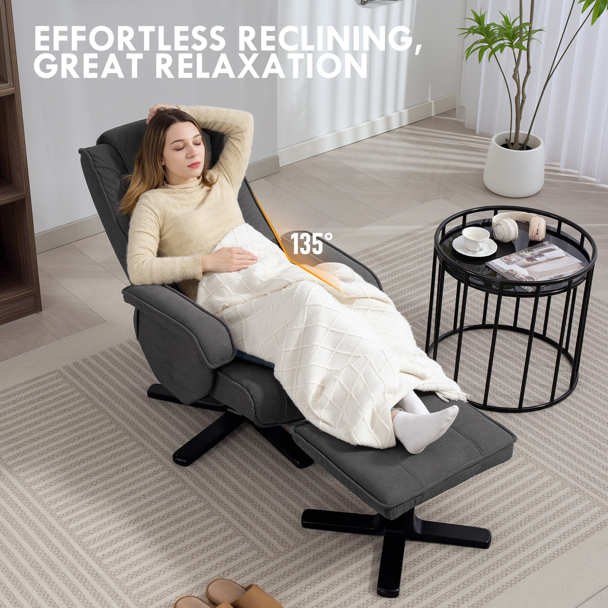 Discover relaxation anew with the Recliner Chair and Footstool. Enjoy limitless comfort as it reclines up to 135°, suitable as your new fireside chair or comfy living room armchair. The 13 cm thick seat padding supports every inch from back to arms, while the 360° swivel feature adds a fun twist to your lounging experience.