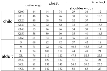 Size: S, M, L, XL, 2XL, 3XL, 4XL, K100, K110, K120, K130, K140, K150, K160