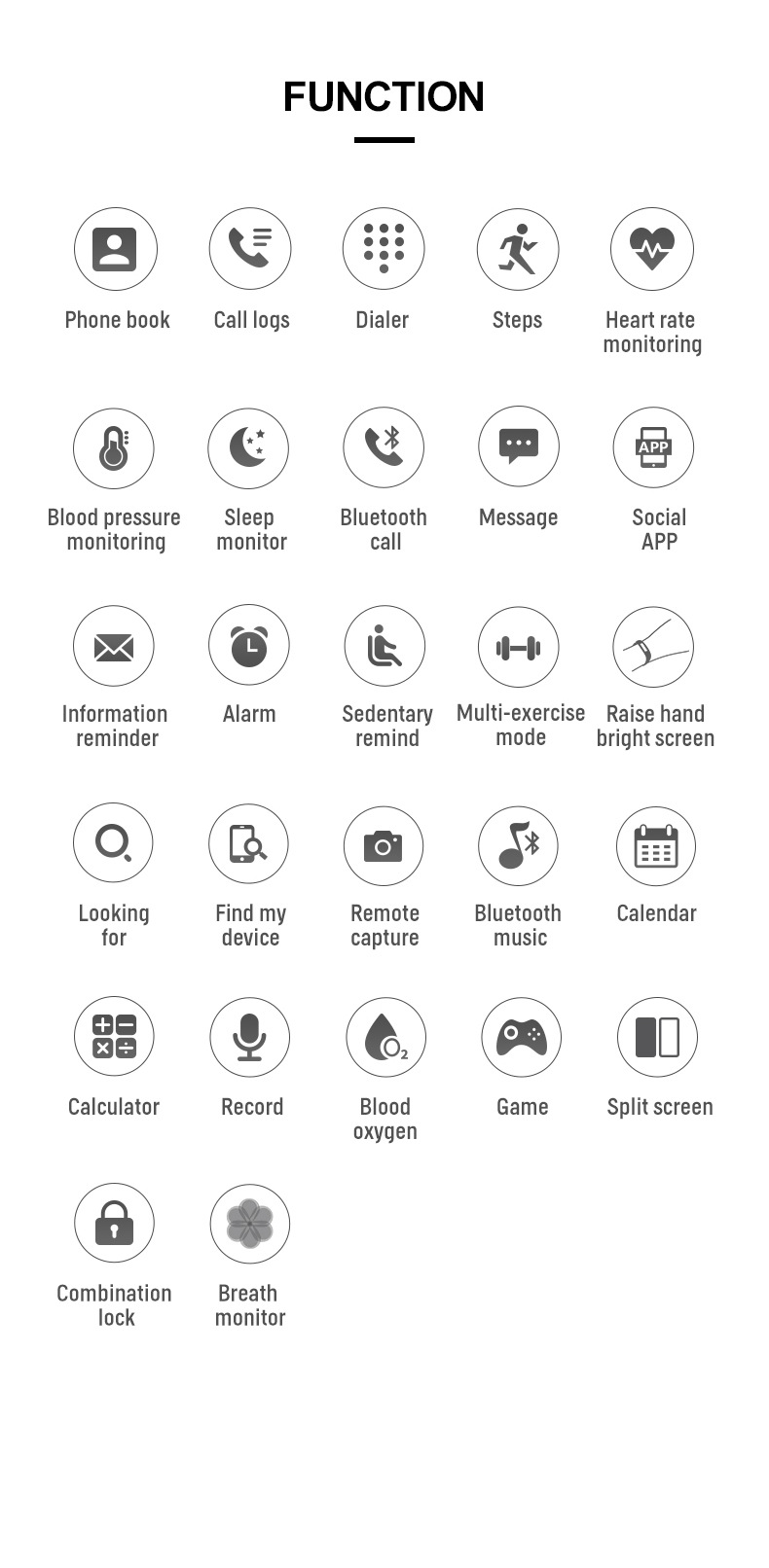 Additional functions: social entertainment, smart reminders, remote control selfies, health monitoring, information push, sports tracking
