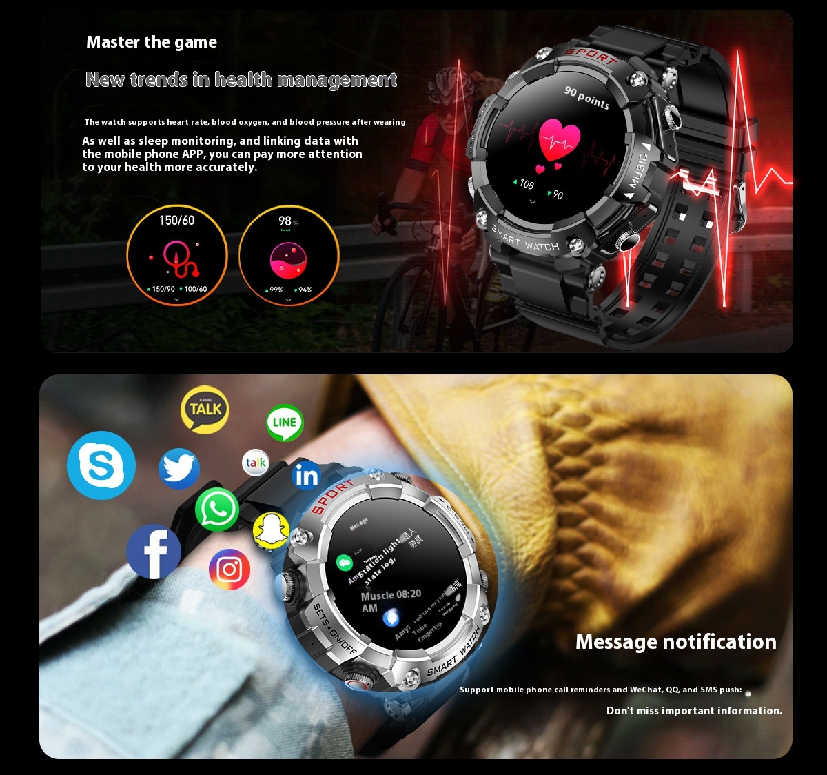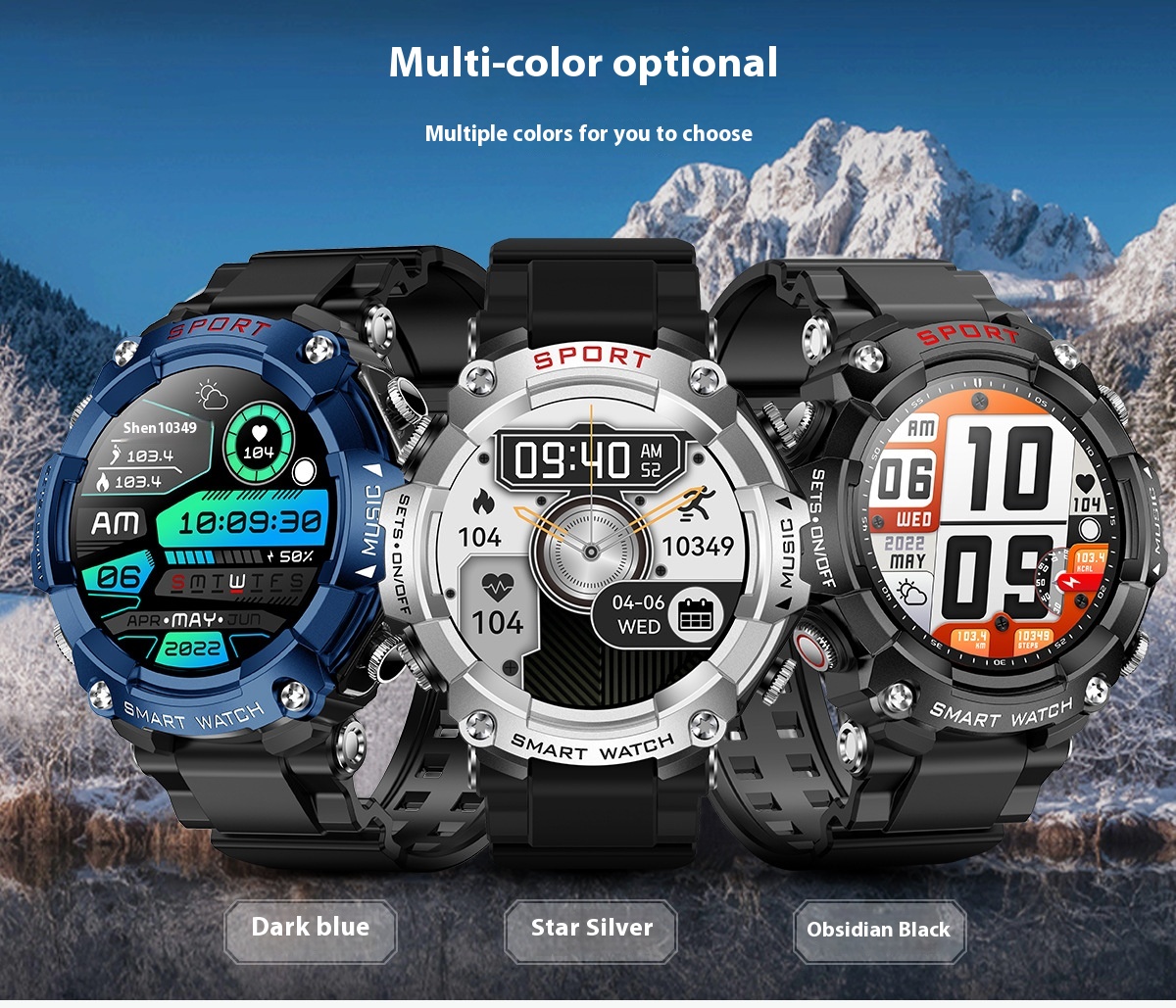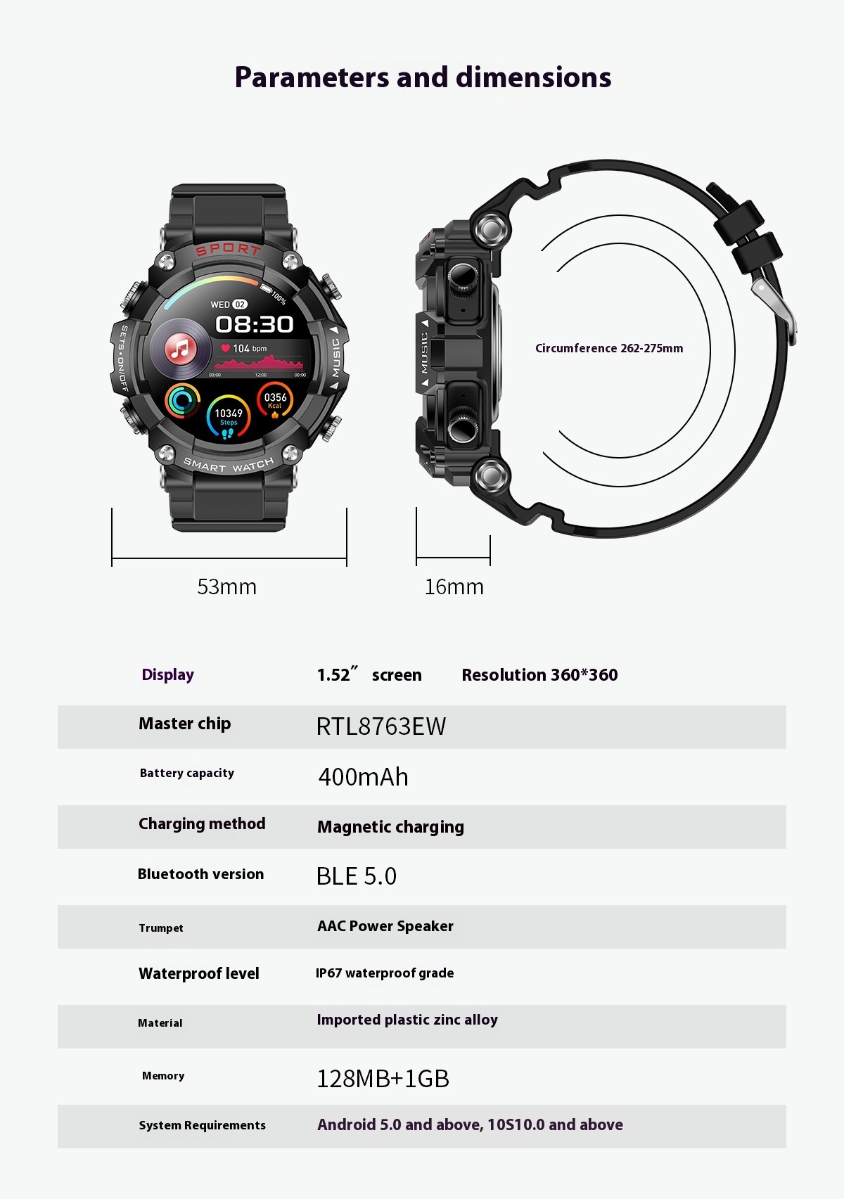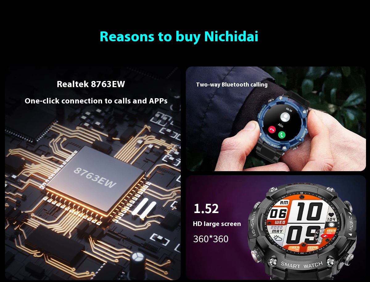 Functions: Waterproof, photographing, step counting, heart rate monitoring, blood pressure measurement, social entertainment, body temperature measurement, Bluetooth calling, NFC function, smart reminder, remote control selfie, sleep monitoring, blood oxygen detection