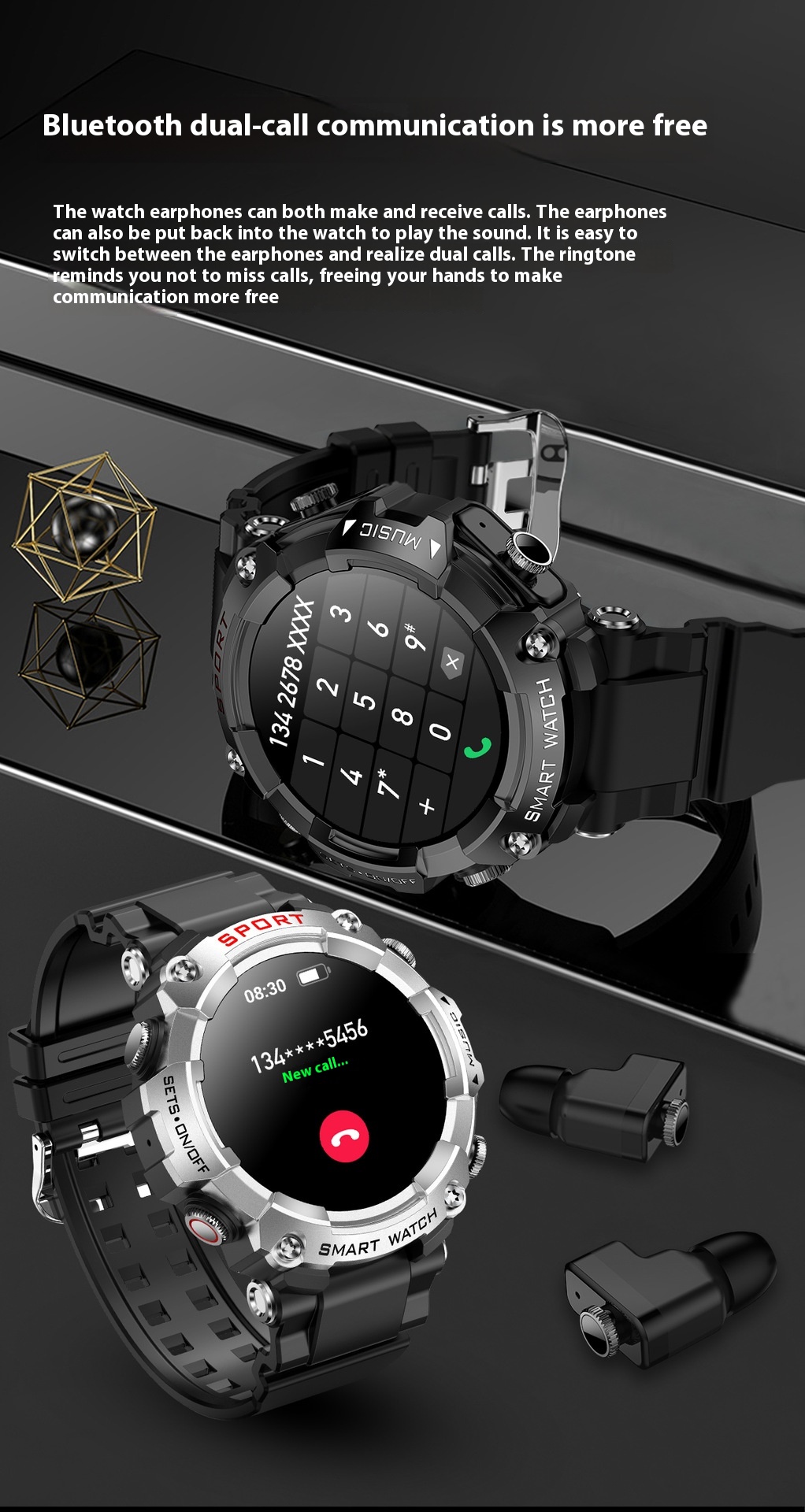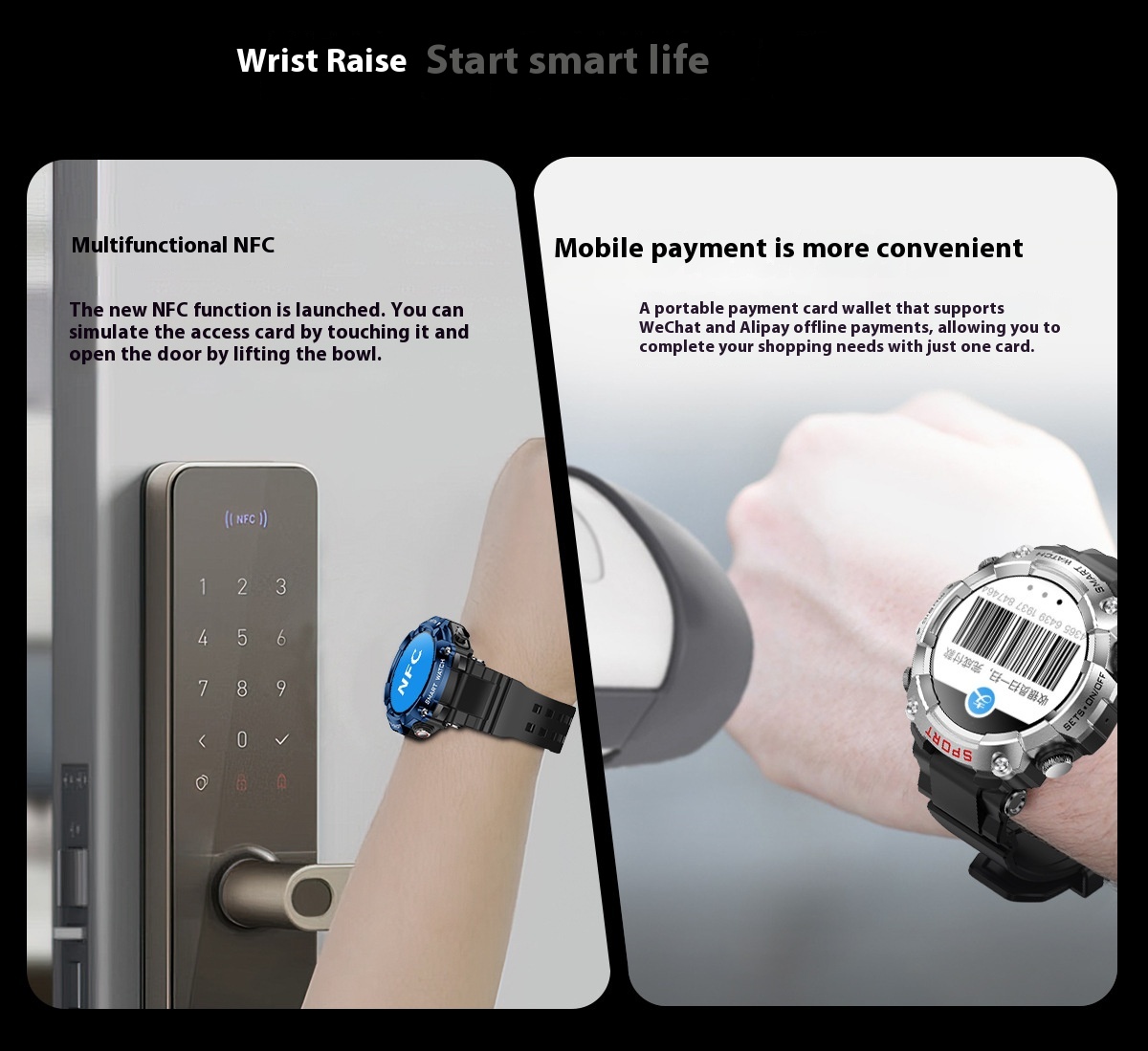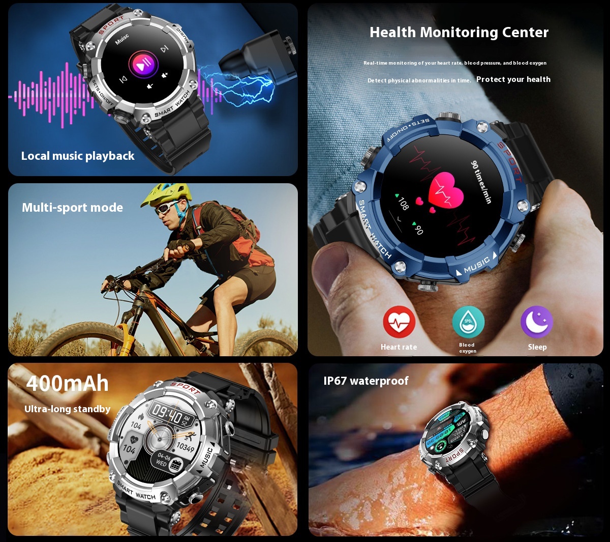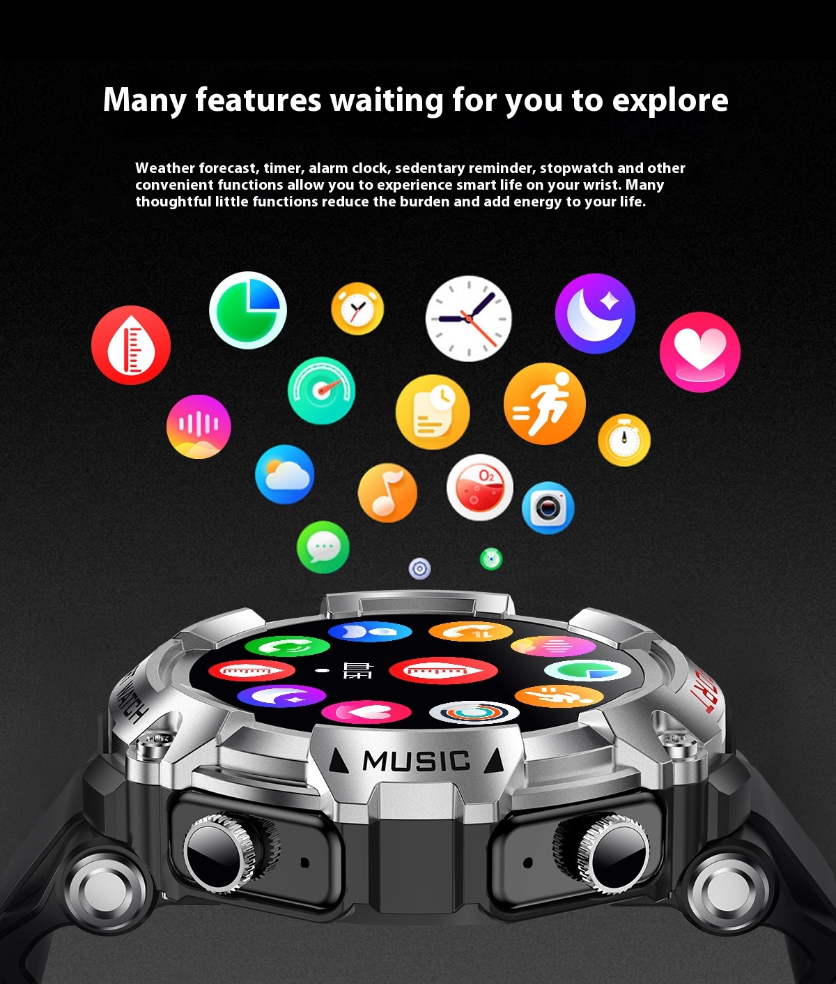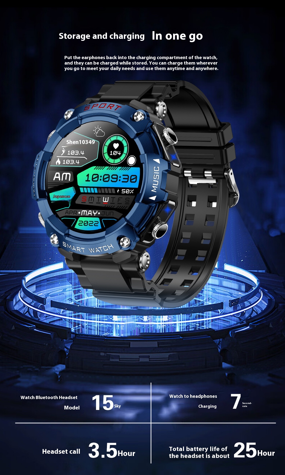 Functions: Waterproof, photographing, step counting, heart rate monitoring, blood pressure measurement, social entertainment, body temperature measurement, Bluetooth calling, NFC function, smart reminder, remote control selfie, sleep monitoring, blood oxygen detection