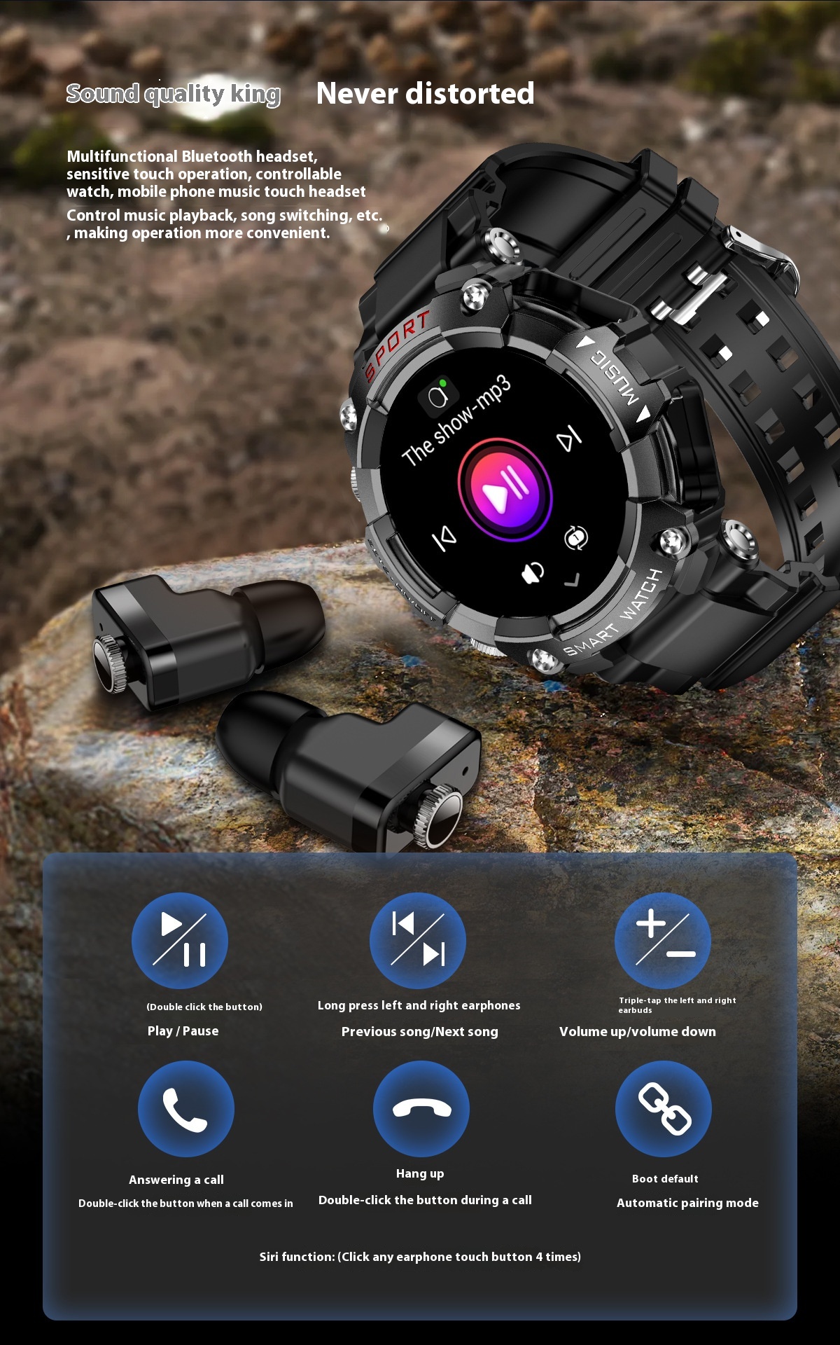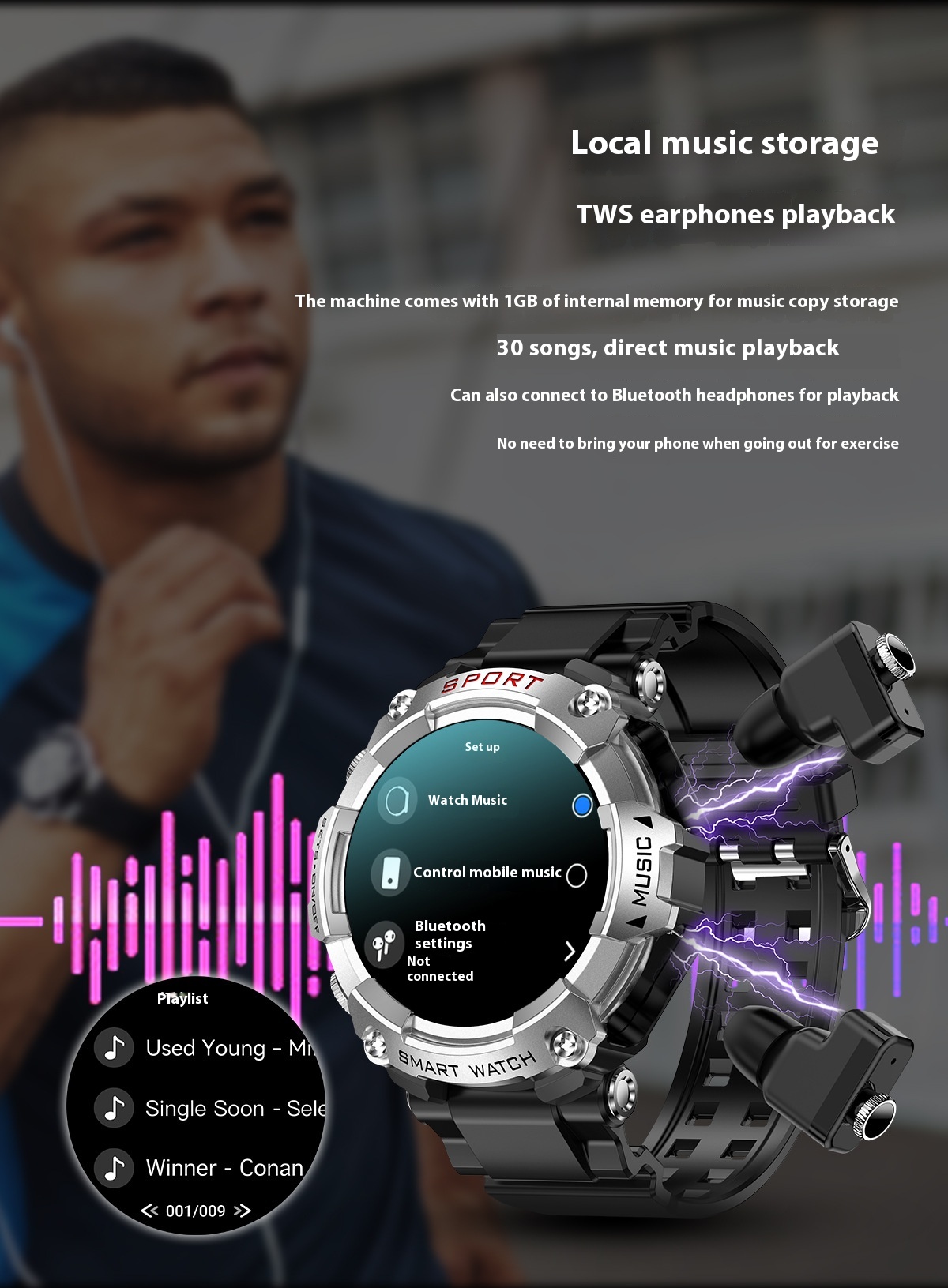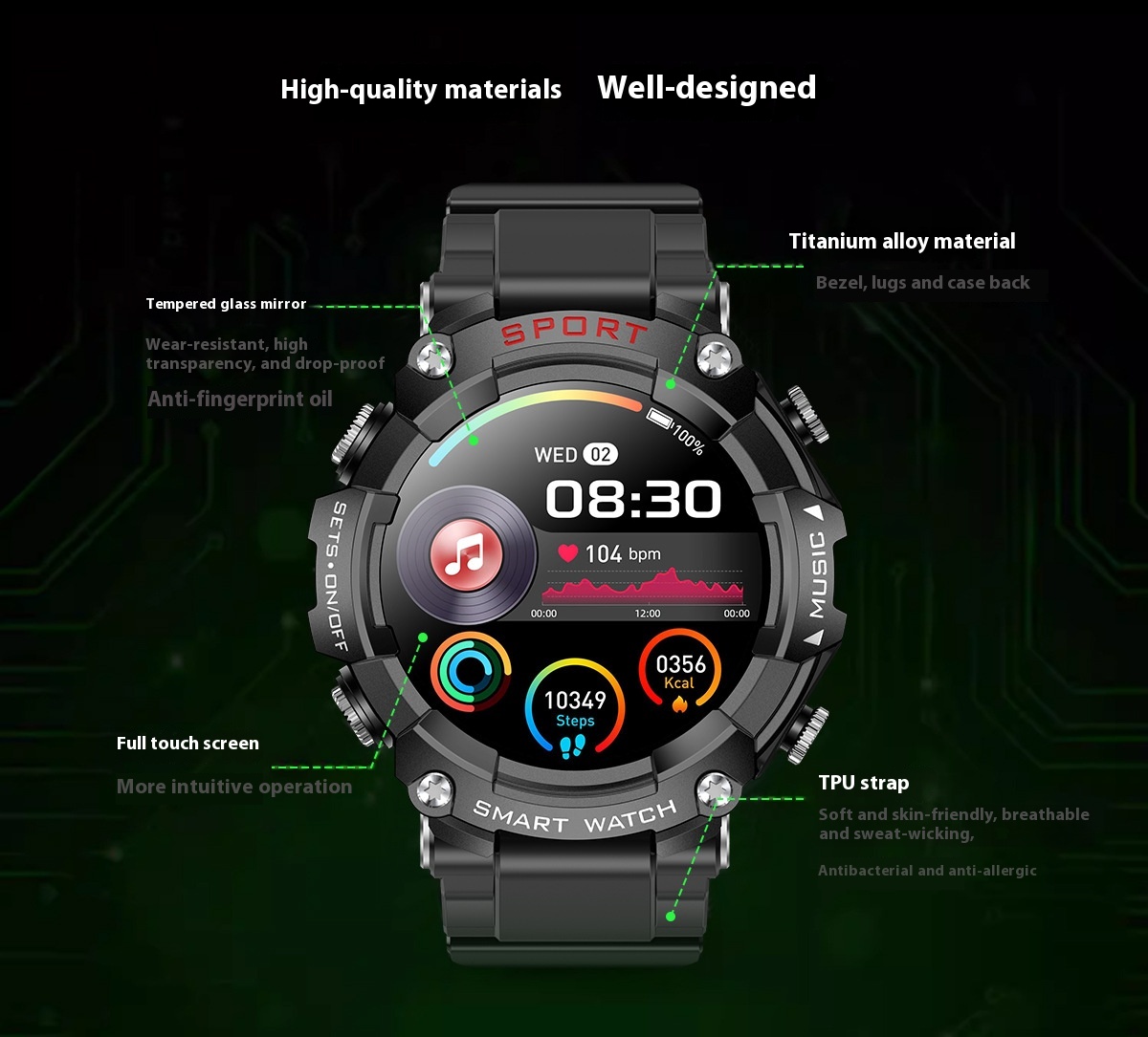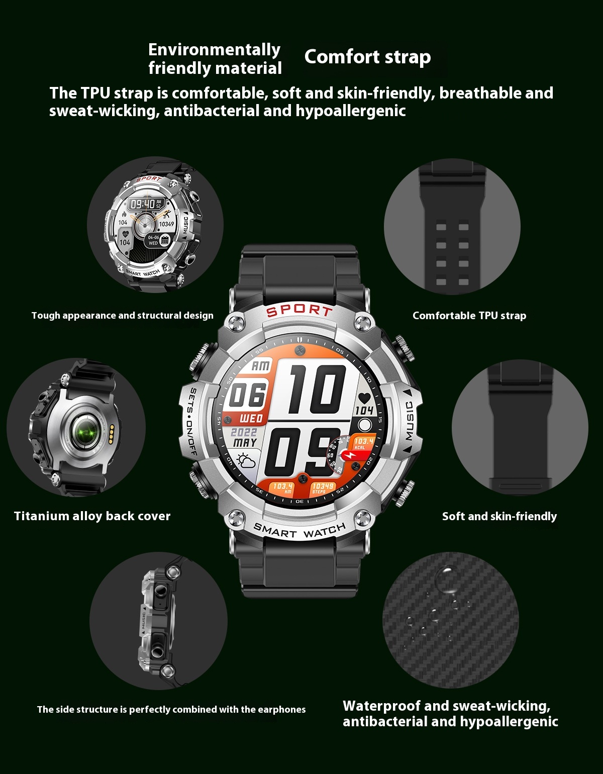 Functions: Waterproof, photographing, step counting, heart rate monitoring, blood pressure measurement, social entertainment, body temperature measurement, Bluetooth calling, NFC function, smart reminder, remote control selfie, sleep monitoring, blood oxygen detection