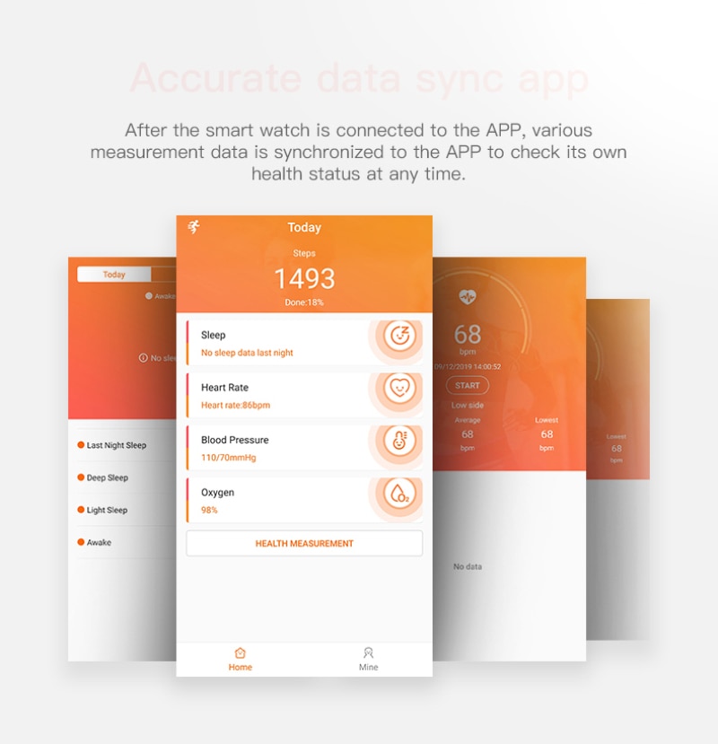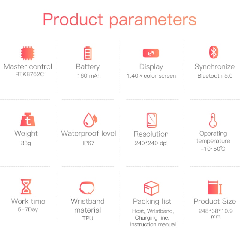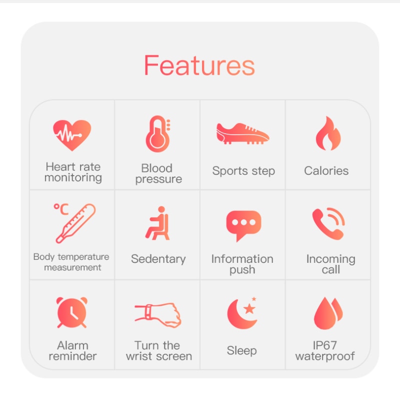 Additional functions: step counting, monitoring, smart reminder, remote control selfie, health monitoring, information push, exercise tracking, sleep analysis