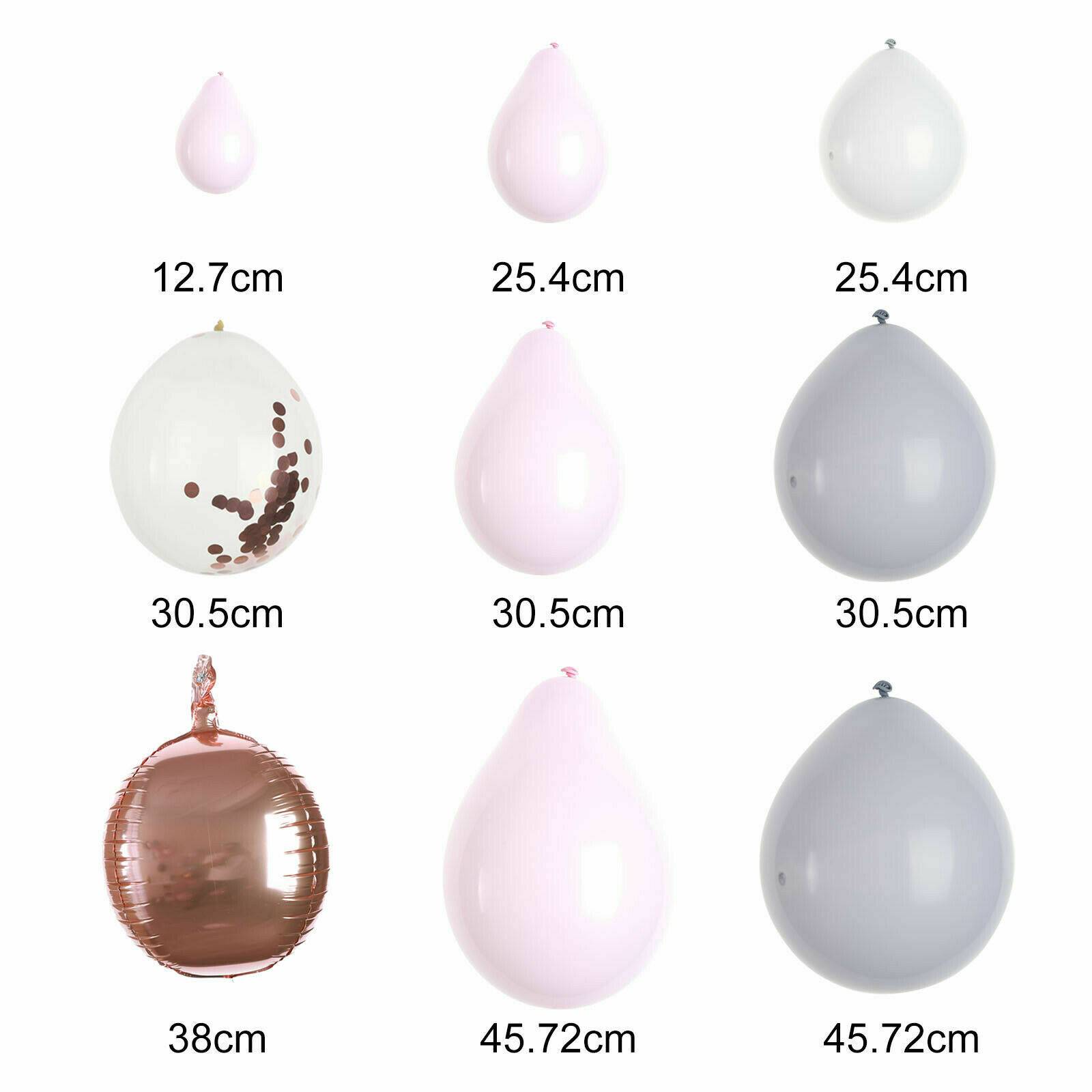PACKAGE INCLUDE: 30pcs 5 inch pink, 50pcs 10 inch macaron pink, 50pcs 10 inch gray, 10pcs 12 inch transparent sequin rose gold, 10pcs 12 inch macarons pink, 10pcs 12 inch gray, 2pcs 18 inch pink , 2pcs 18-inch macarons gray, 3pcs 15-inch gold 4D aluminum film, 1pcs balloon chain, 1pcs glue dot.NOT include leaves.