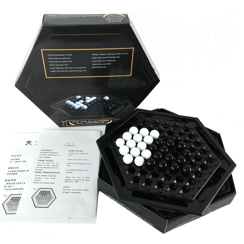 This beautiful and functional board has room for two teams of large marbles. Players take turns pushing the marbles around the board, with the goal of pushing six of the opposing player's marbles off the board. The central idea is that a column of marbles has weight given by the number of marbles in line. Someone will need to push with a heavier group of marbles in order to push the column along that axis. However, with six possible directions, it's difficult to defend yourself perfectly. Also, it's possible to play the game with up to six players when supplemental marble sets are purchased.