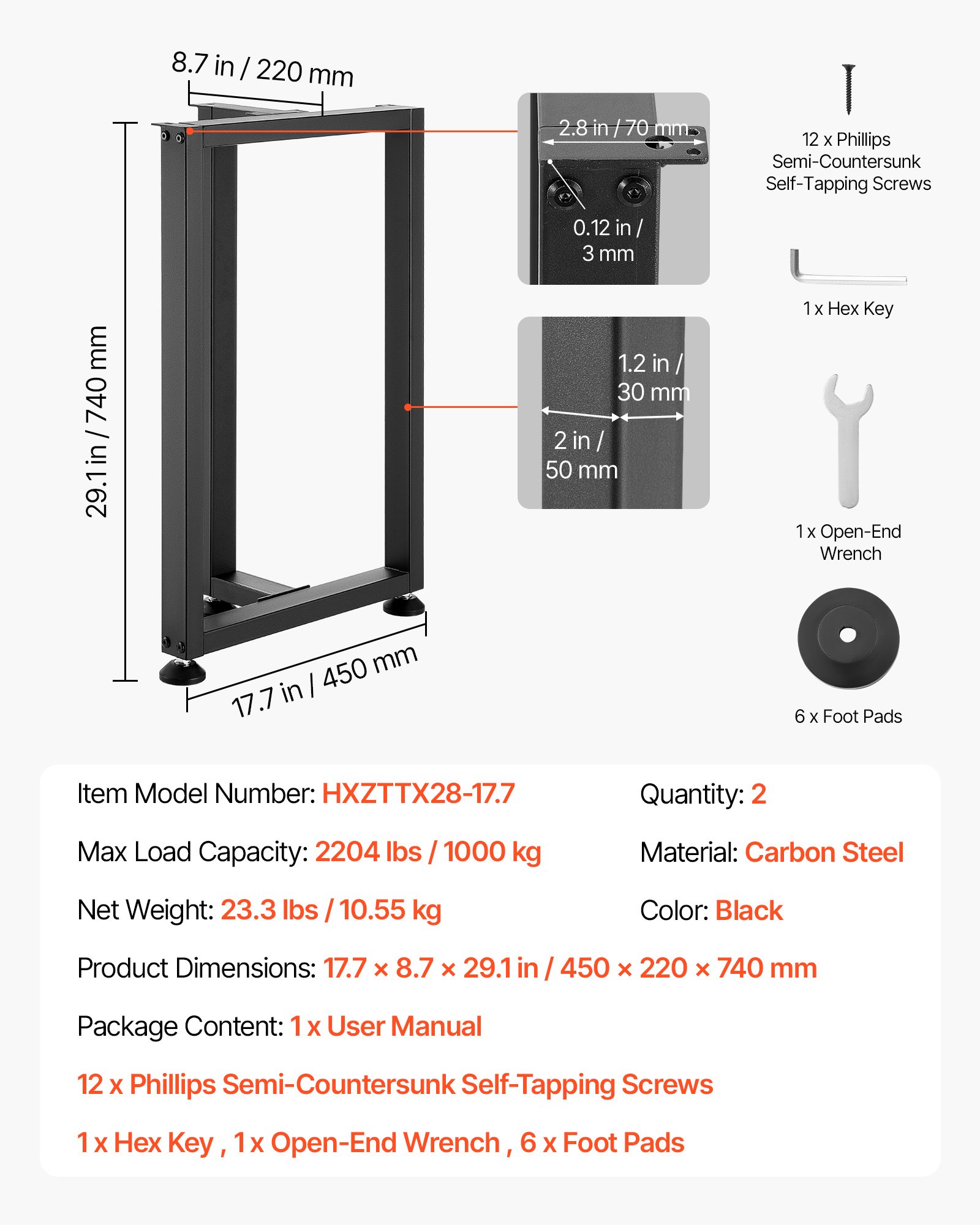 Exceptional Load Capacity: Supports up to 2204 lbs / 1000 kg, these table legs can hold heavy tabletops or even build a medium to large dining table for 6-8 people. Strong support helps keep the table stable and withstands to deformation over time