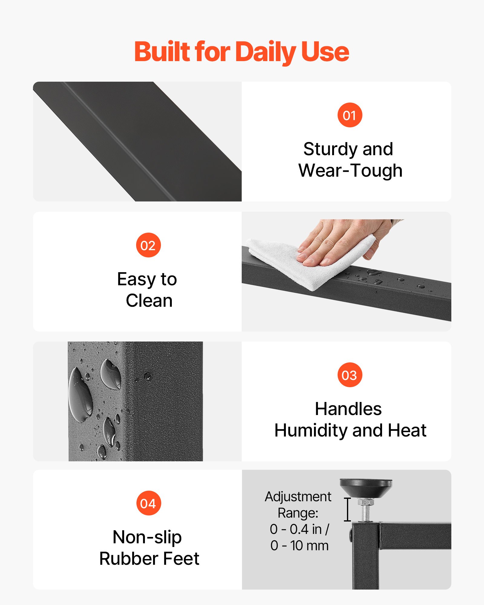 Engineered for Durability: Constructed from high-strength carbon steel, each table leg features a powder-coated surface that resists fingerprints and cleans easily. Features 0-0.4 in / 0-10 mm adjustable leveling feet to help you easily level the table