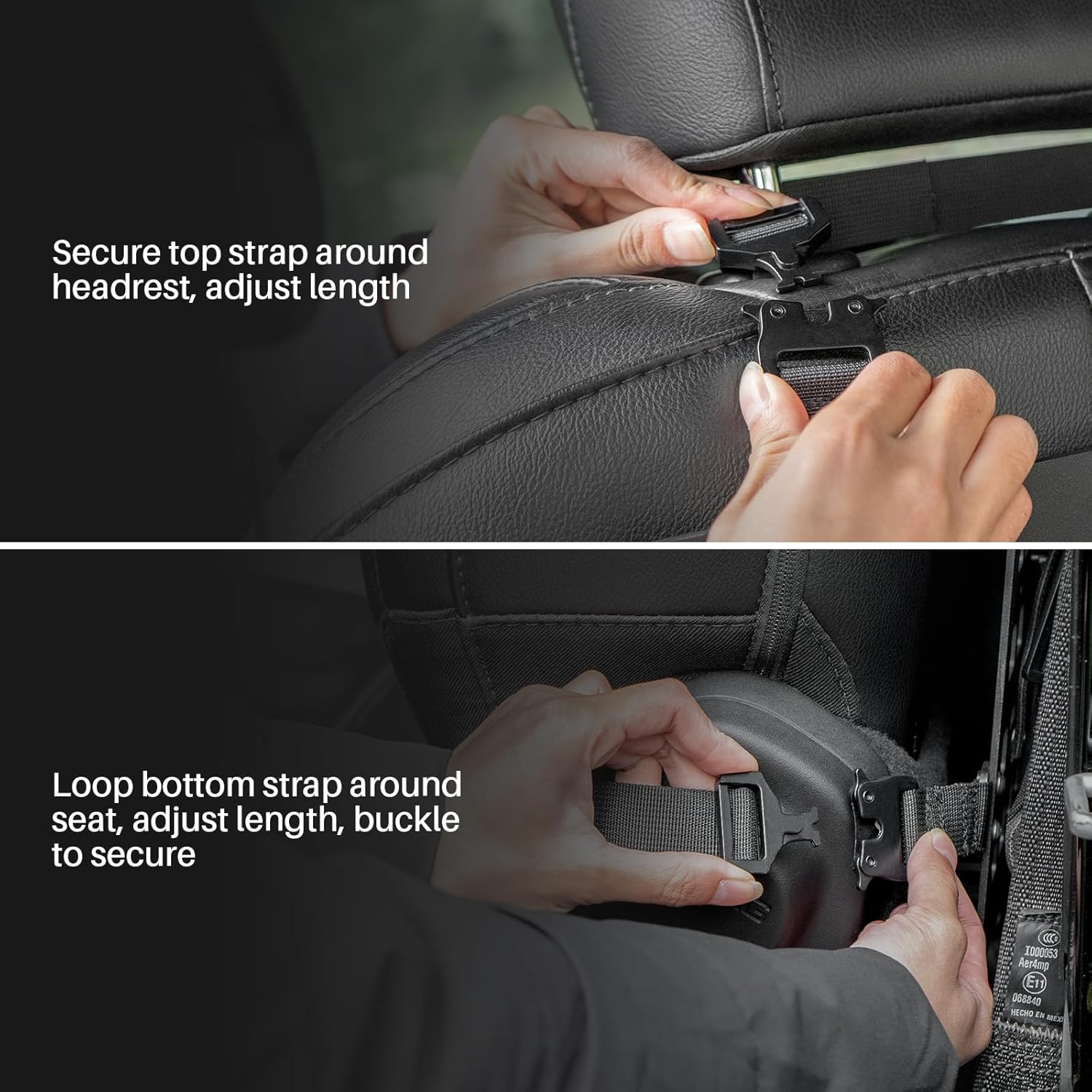 How to Use: Secure the car organizer in 2 steps; wrap the top strap around the headrest and adjust; loop the bottom strap around the seat, adjust, and buckle to secure