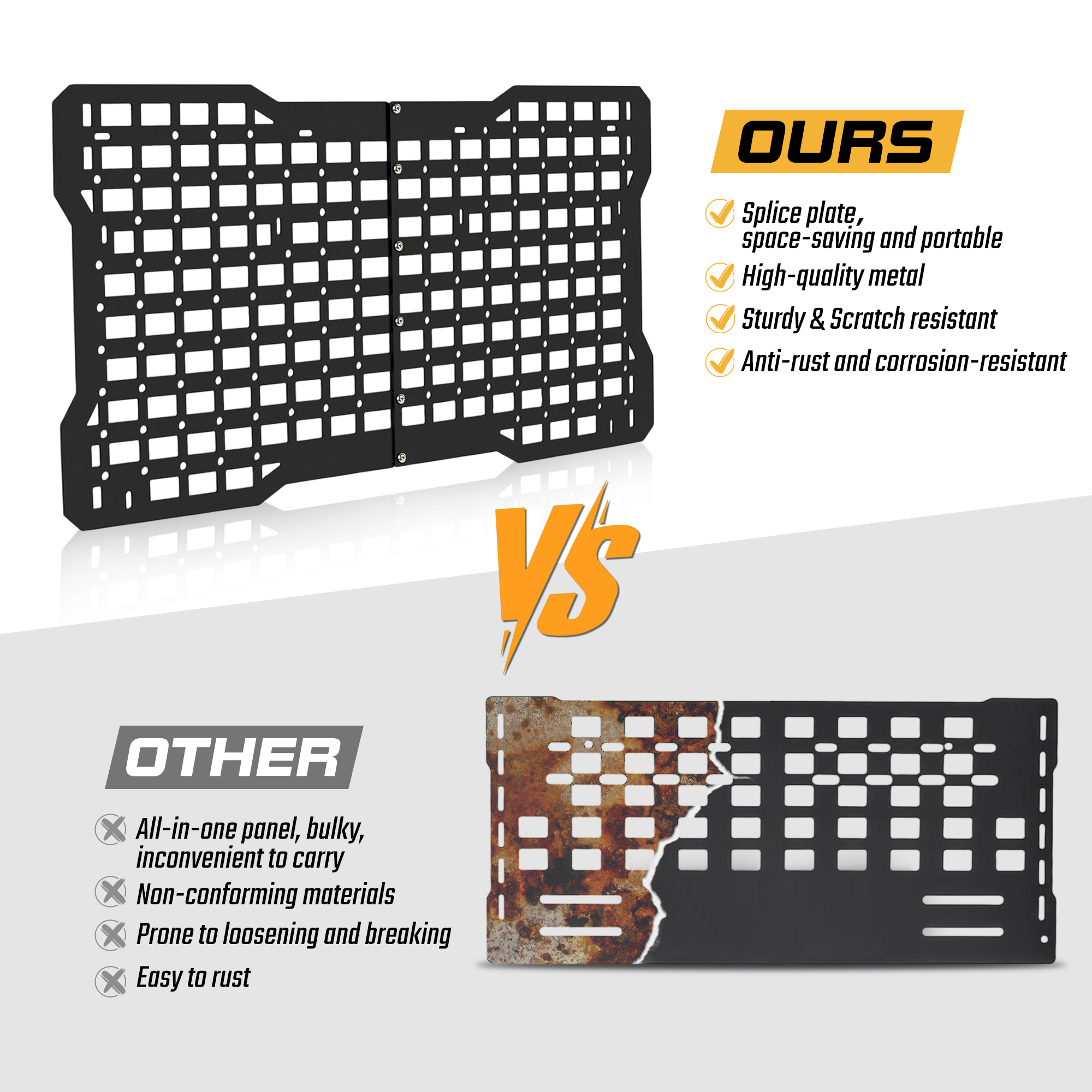 【Excellent Material】The tailgate tactical moll panel is made of high quality aluminum alloy, which is waterproof, rust-proof and easy to clean. Compared to other polyester tactical boards, it can be used for a long time to hold many heavy objects without deforming or tearing.