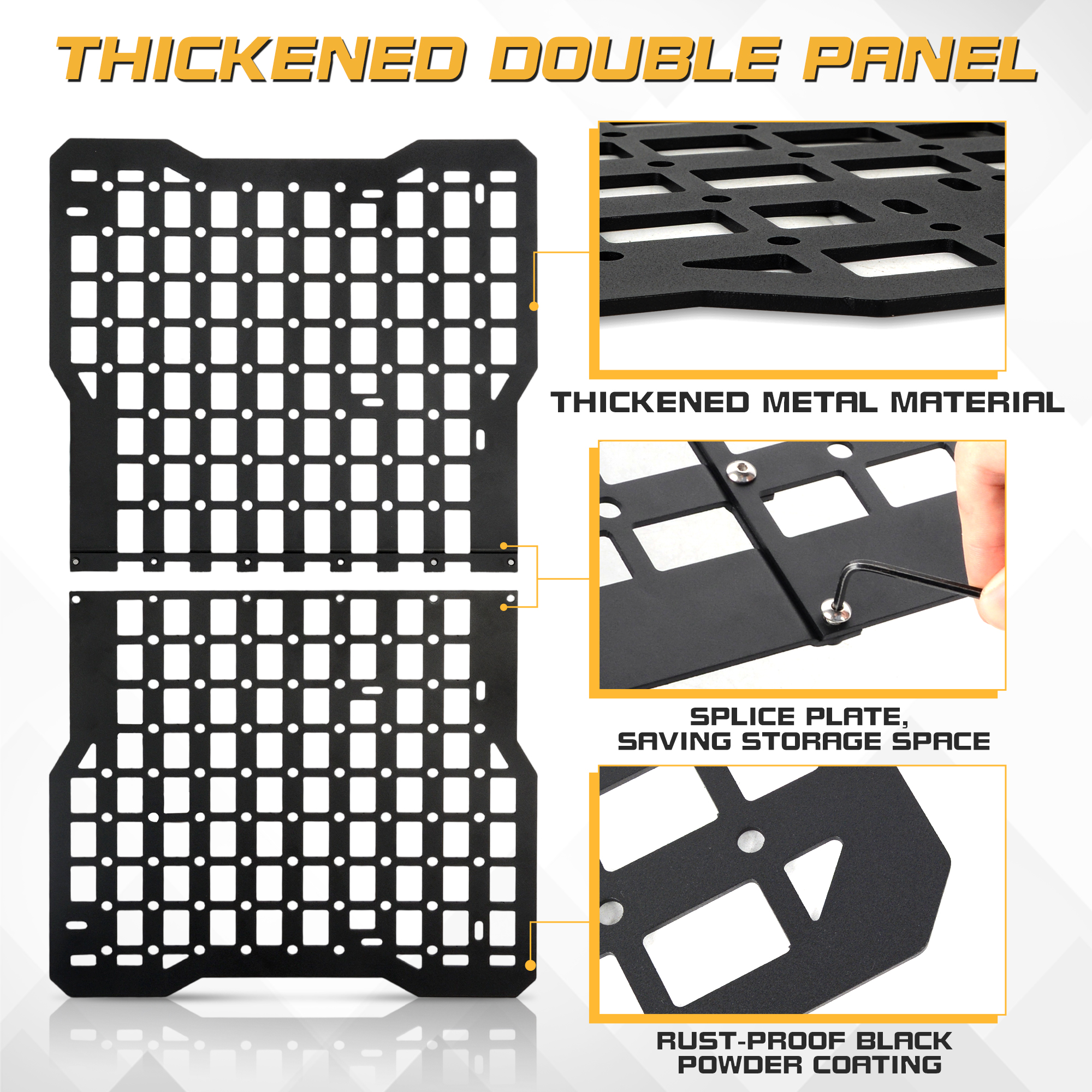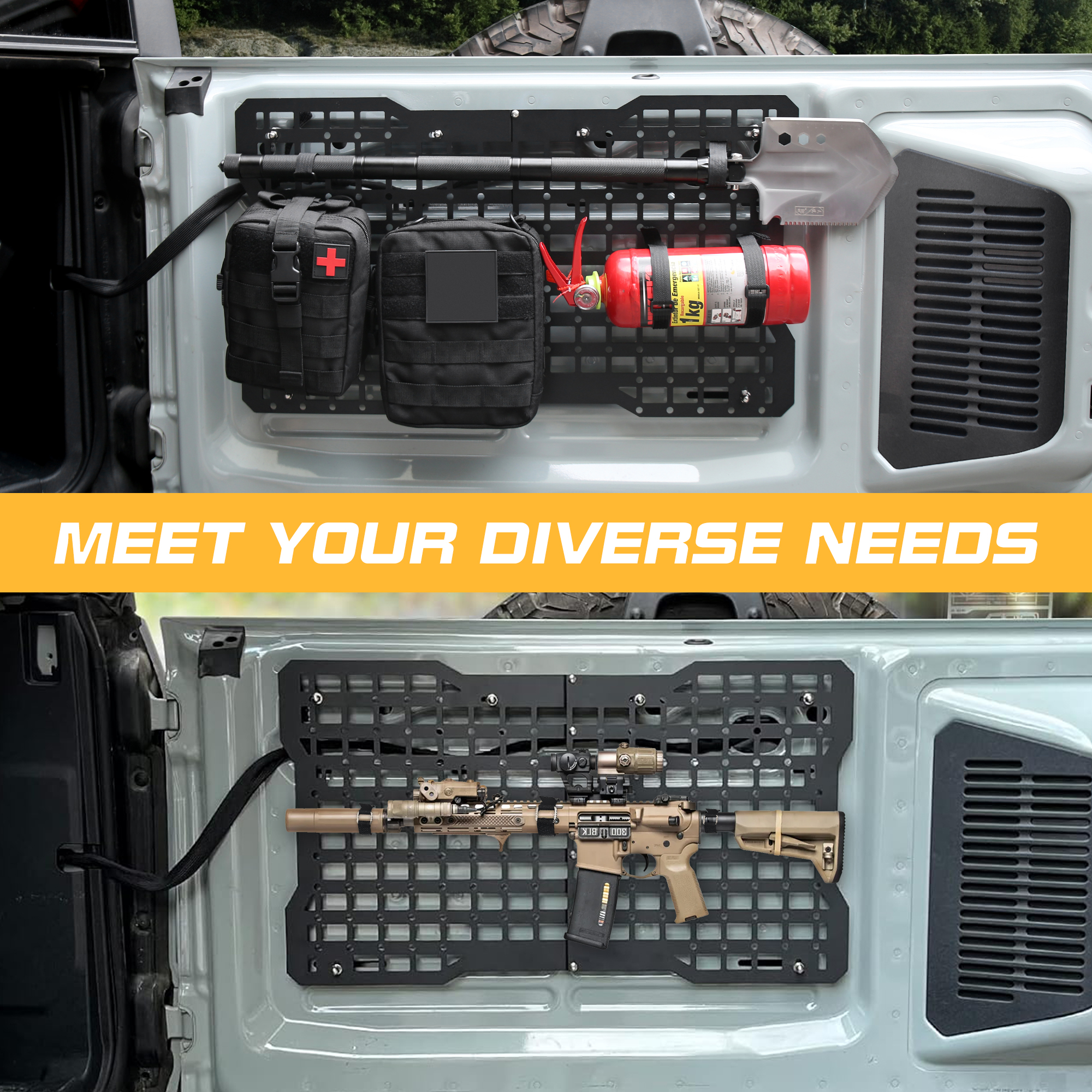 【MOLLE System】The MOLLE Panel allows storage in unused side space; Reliable mounting solution for your off-road tools: fuel tank,molle bags, trail gear, high lift jacks, hunting gear, fishing equipment or shovels.