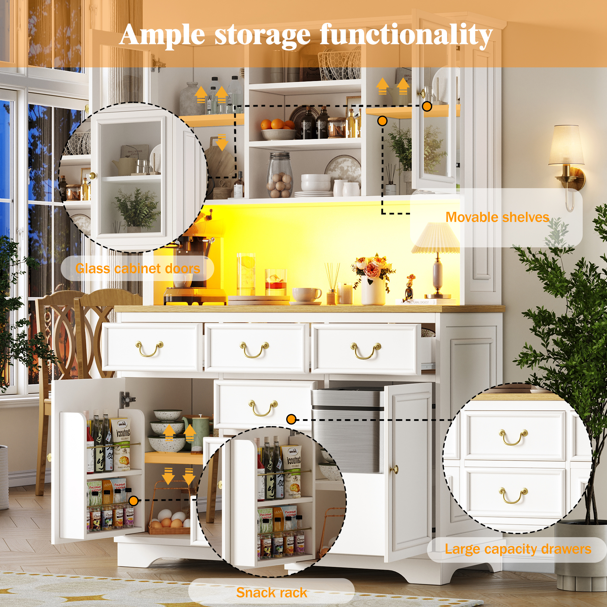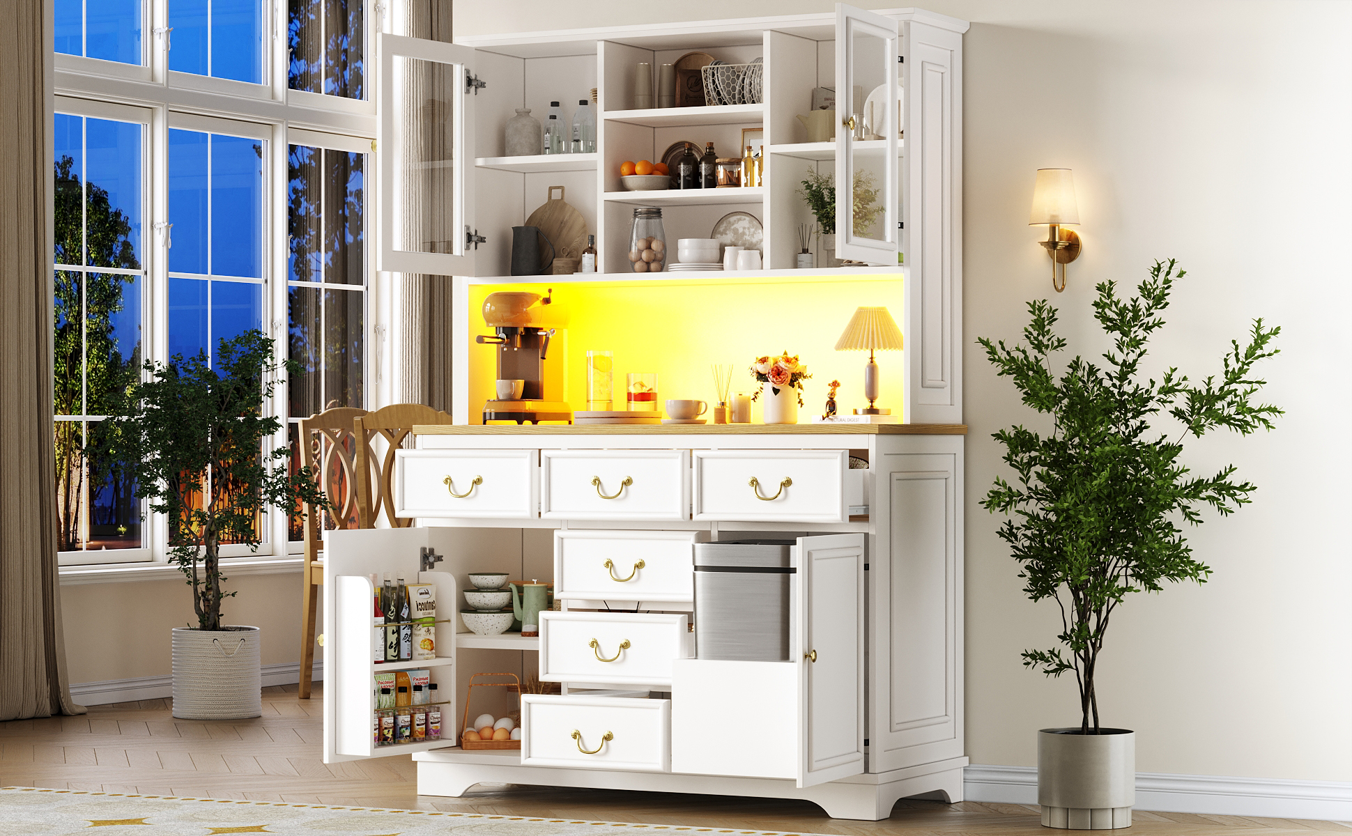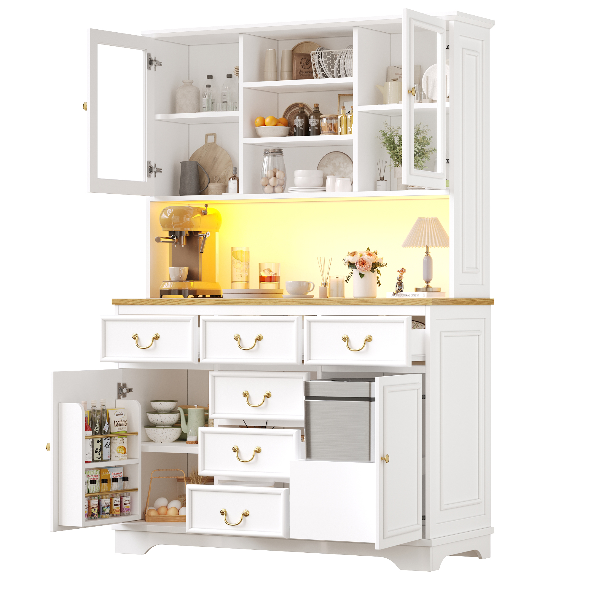 Product Name:Tall kitchen cabinet with USB ports and sockets, sideboard with LED light strip, kitchen cabinet, storage cabinet with snack shelf doors, sideboard, waste bin can be installed, white