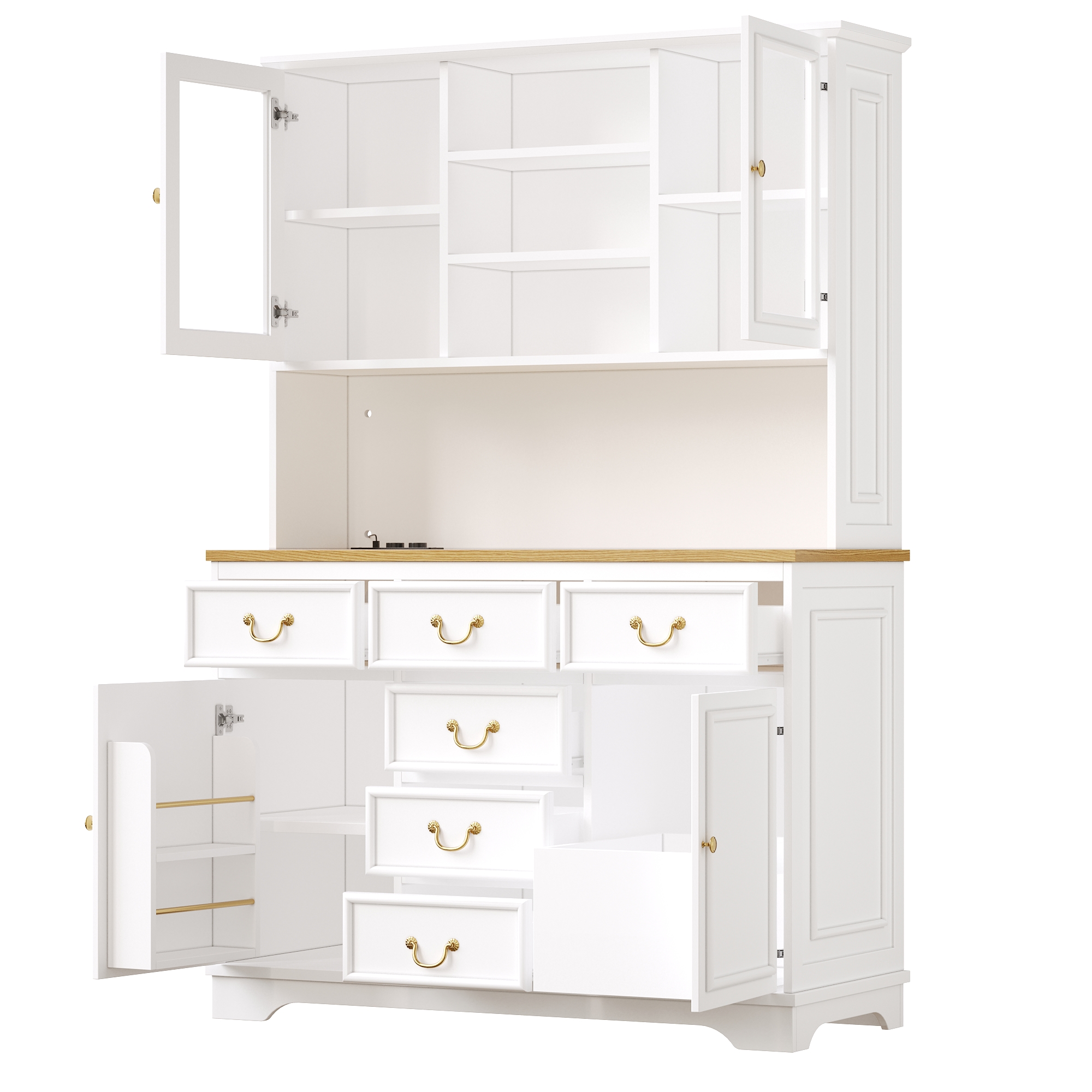 Keeping your kitchen tidy and organized is a breeze thanks to the sophisticated storage concept of this tall cabinet. It offers an impressive variety of smart storage solutions. Generous, heavy-duty drawers are perfect for pots, supplies, or kitchen utensils. The flexible and adjustable shelves allow you to customize the interior to your individual needs – whether for glass bottles or small spice jars. Elegant glass-fronted cabinets provide space for beautiful dishes or glasses, showcasing them decoratively. A particularly practical feature: the special snack rack ensures that small treats are always within easy reach and neatly organized. Every inch is used to its full potential.