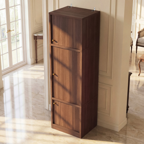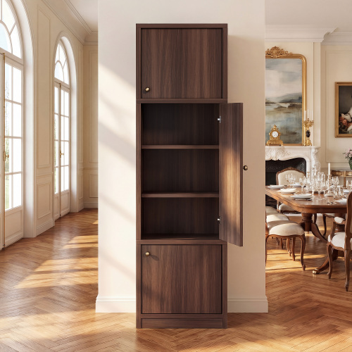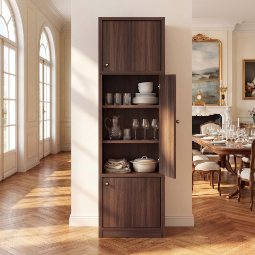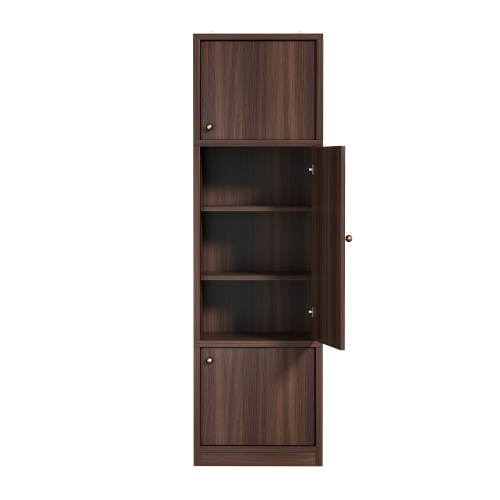 4.E1-GRADE WOOD TALL STORAGE CABINET – Built with E1-grade wood board for reliable quality; thicker panels offer durable scratch/moisture resistance; warm white or walnut finish complements modern styles in bathroom storage cabinet areas.