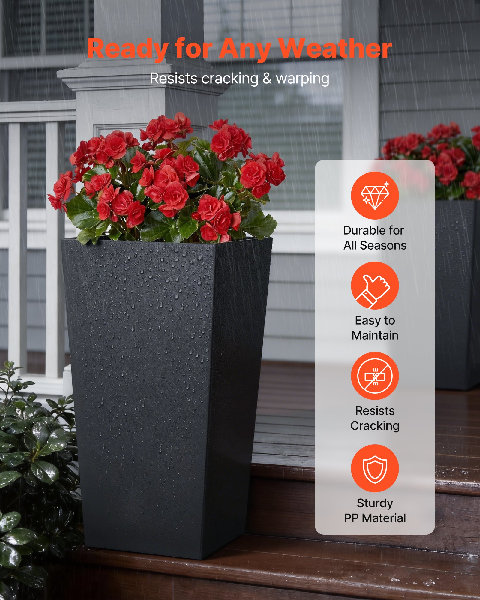 Easy to Move: Engineered for stability, our front porch tall planters remain secure even in harsh weather. Built-in bottom casters allow you to reposition them effortlessly, making placement simple even in tight spaces