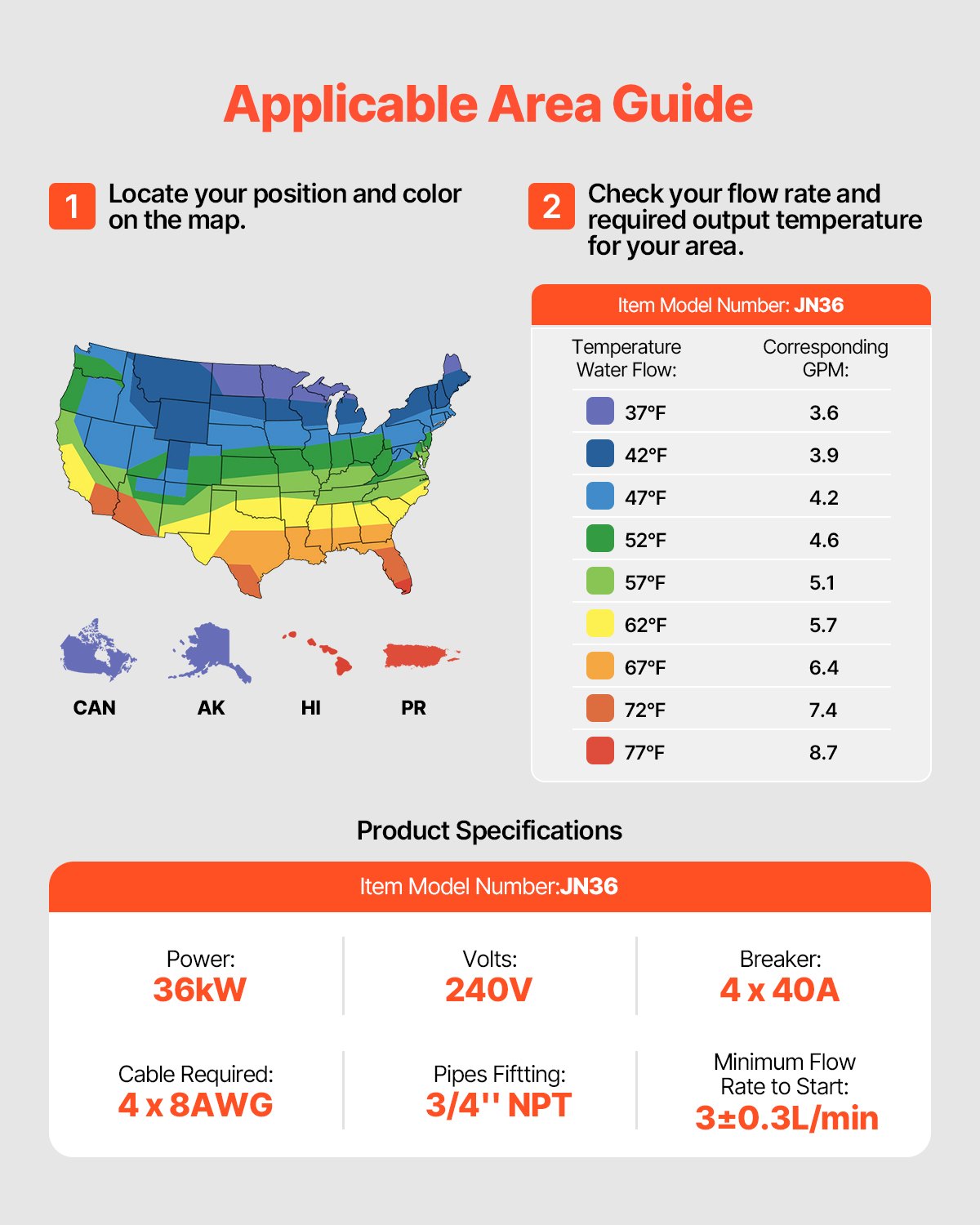 Easy Installation: We include a 3/4'' NPT inlet/outlet, and the installation requires 4x40A circuit breakers and 4 pieces of 8AWG wire. The instant water heater comes with detailed installation instructions for easy setup