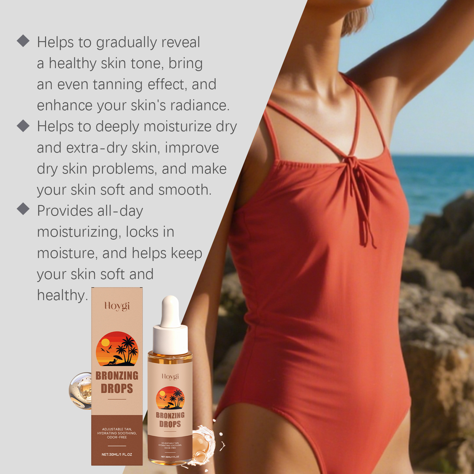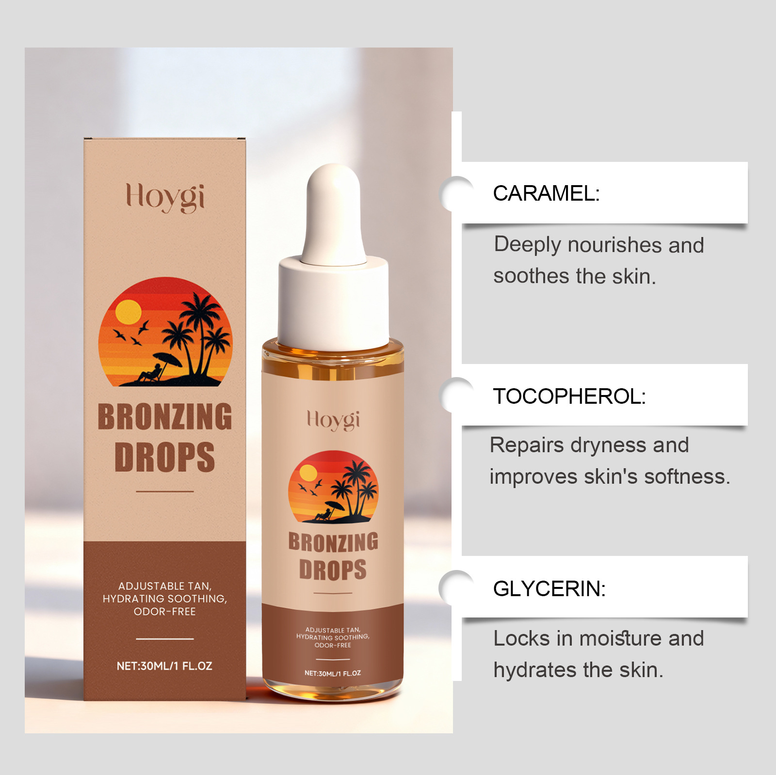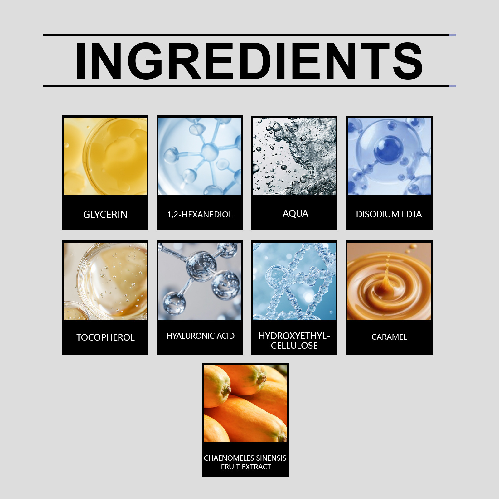 Ingredients: water, glycerin, caramel color, hydroxyethyl cellulose, 1,2- hexanediol, disodium EDTA, hyaluronic acid, papaya fruit extract, tocopherol (vitamin E).