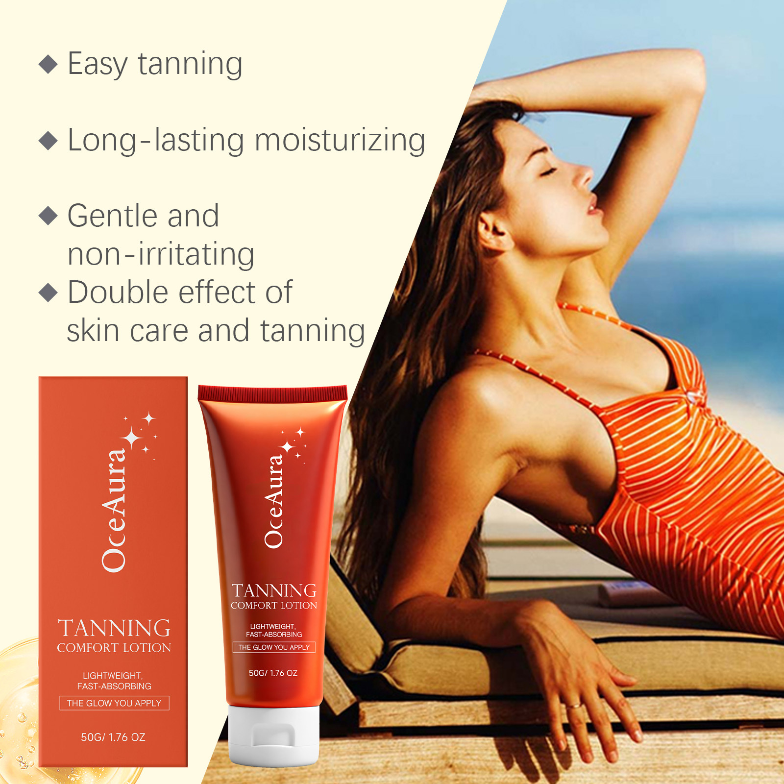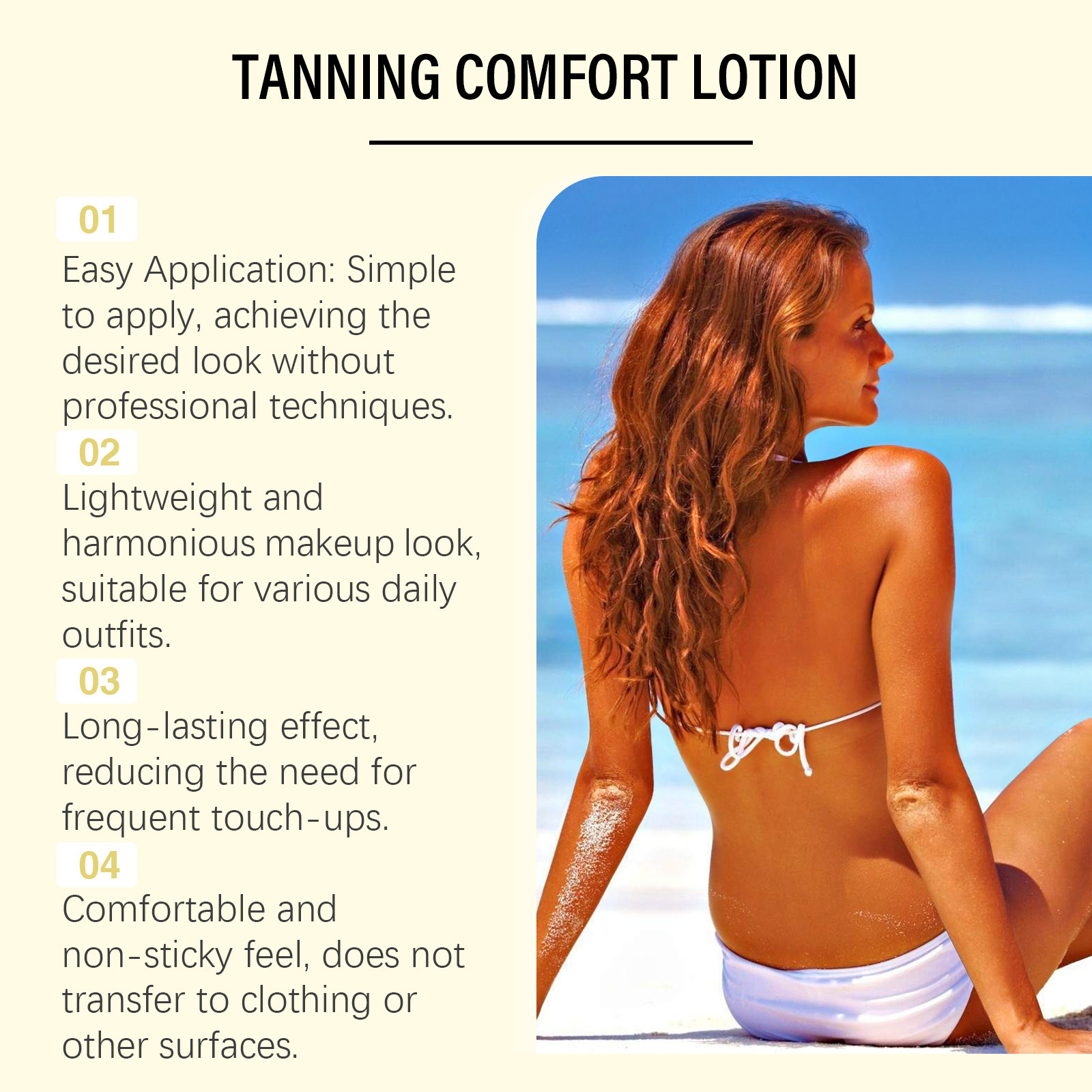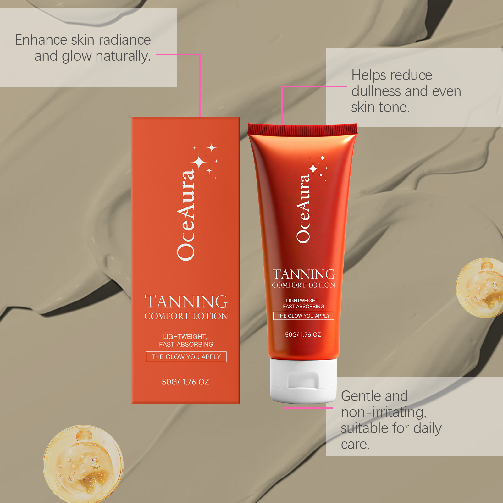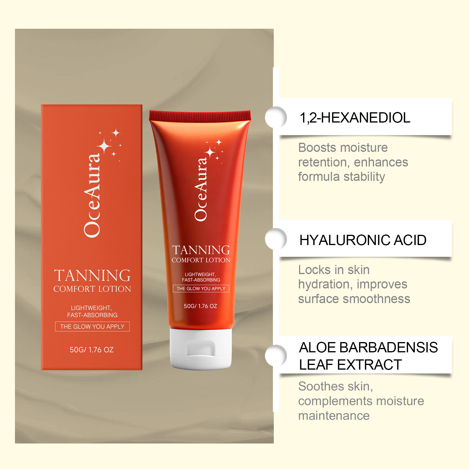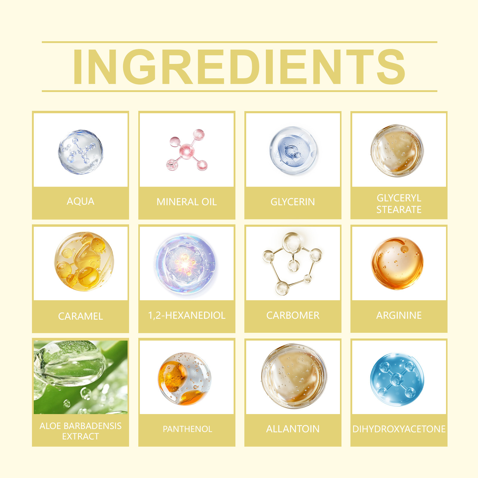 Ingredients: water, mineral oil, glycerin, glyceryl stearate, caramel color, 1,2- hexanediol, carbomer, arginine, aloe vera extract, panthenol, allantoin and dihydroxyacetone.