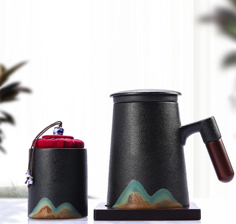 2Set: gray and white wooden handle teacup + tea canister + coaster + gift box