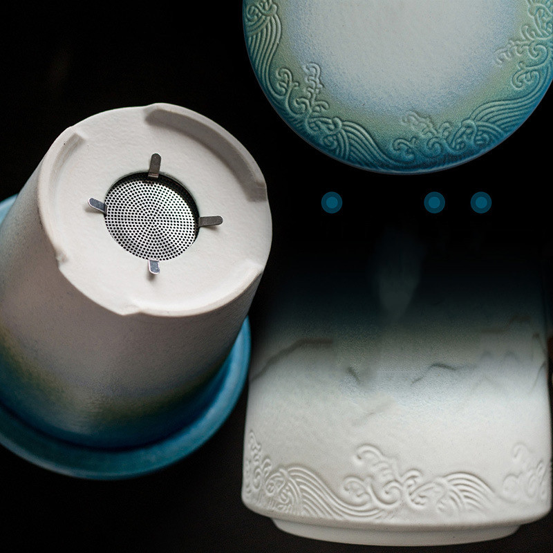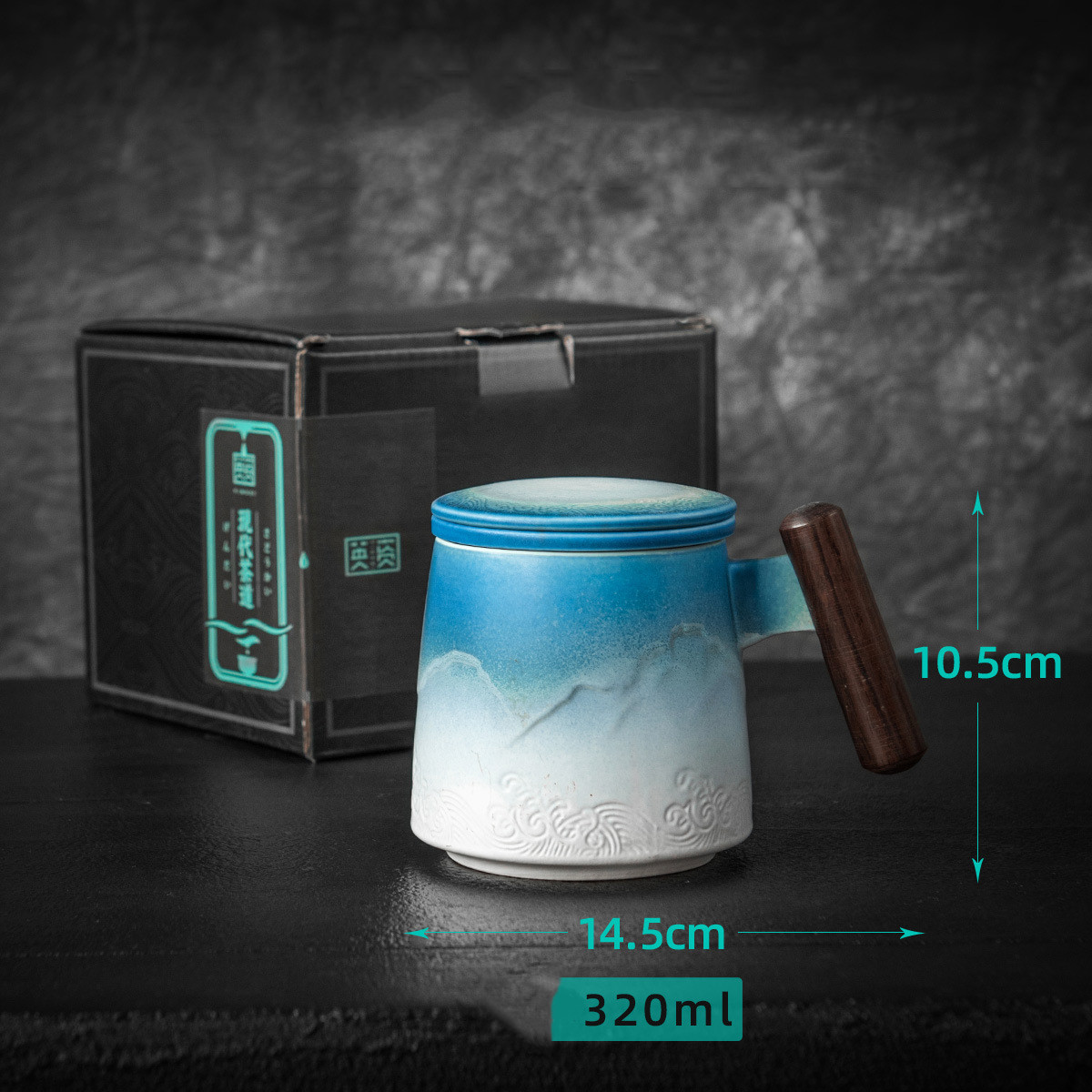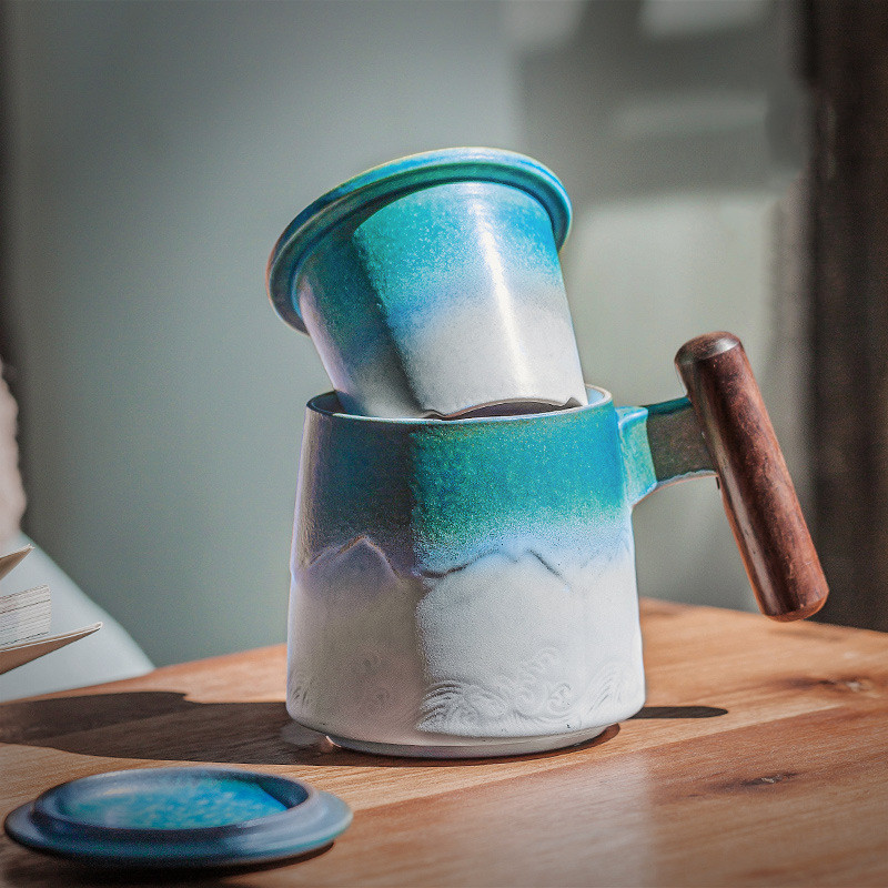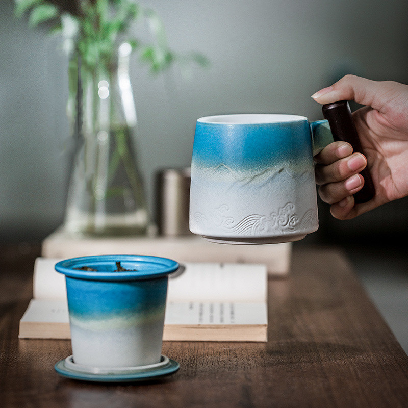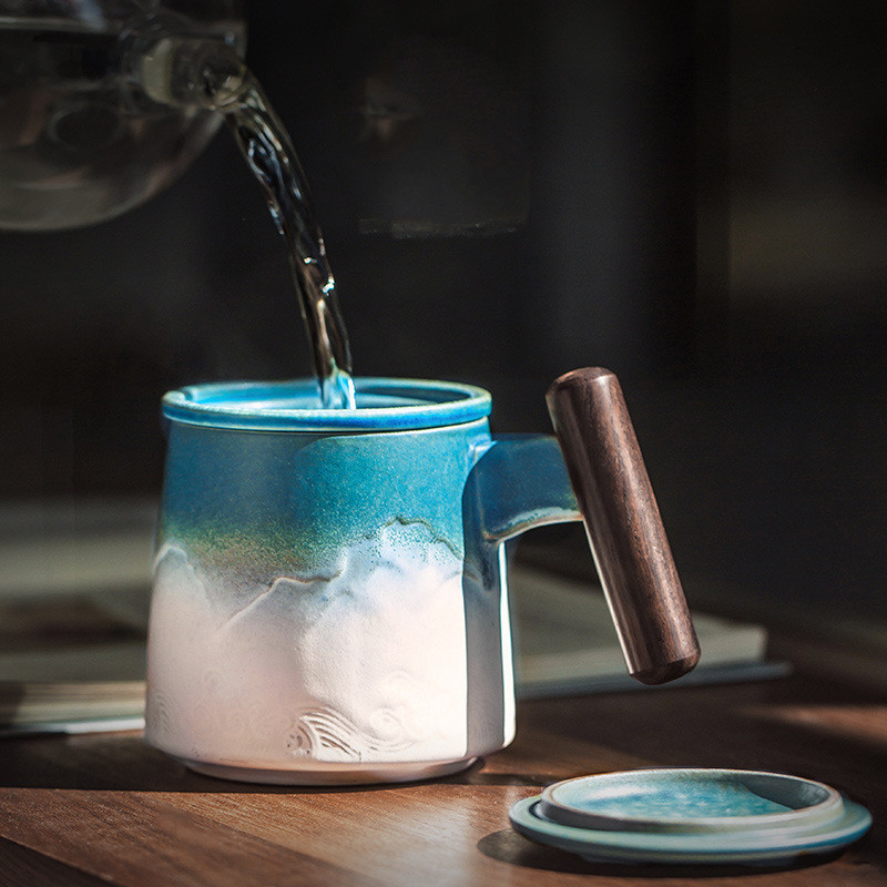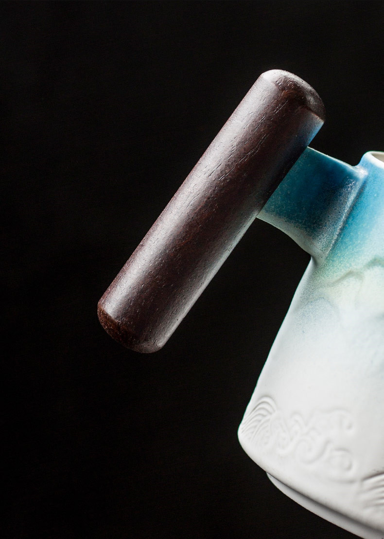Wooden handle filter cupMaterial: CeramicLength: 14.5cmWidth: 10.5cmHeight: 9.5cmNet weight: 579gCapacity: 320mL