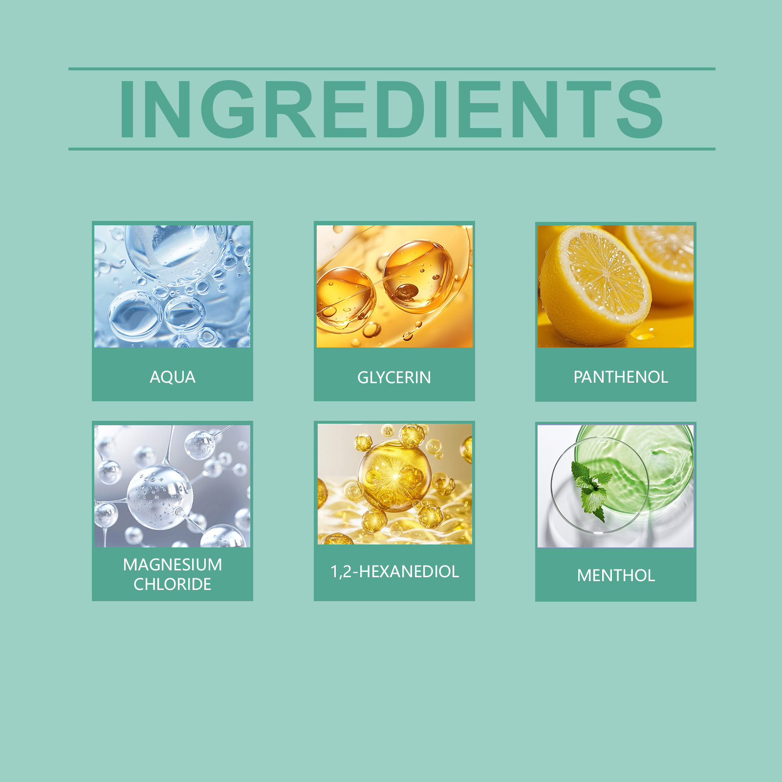 Product information:Ingredients: water, glycerin, citric acid, panthenol, 1,2- hexanediol, menthol.