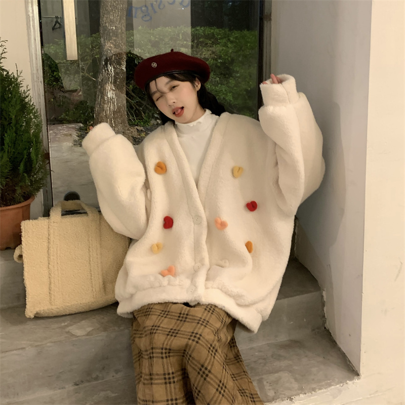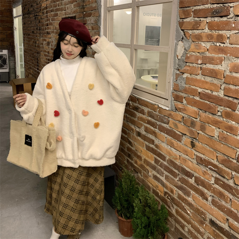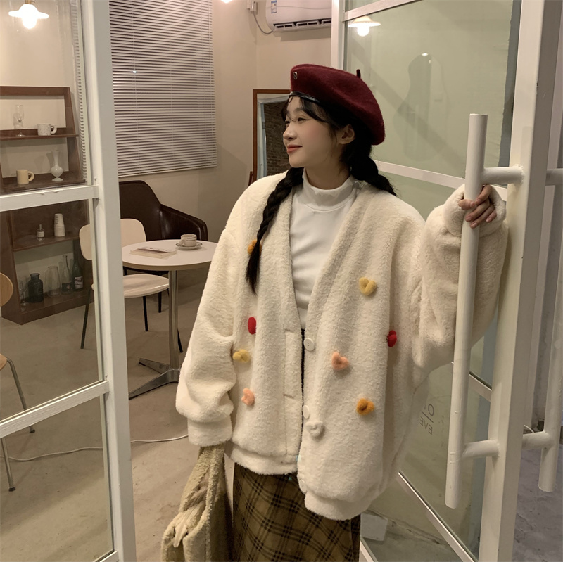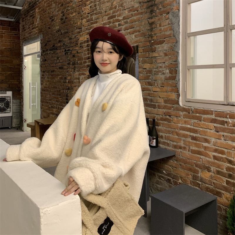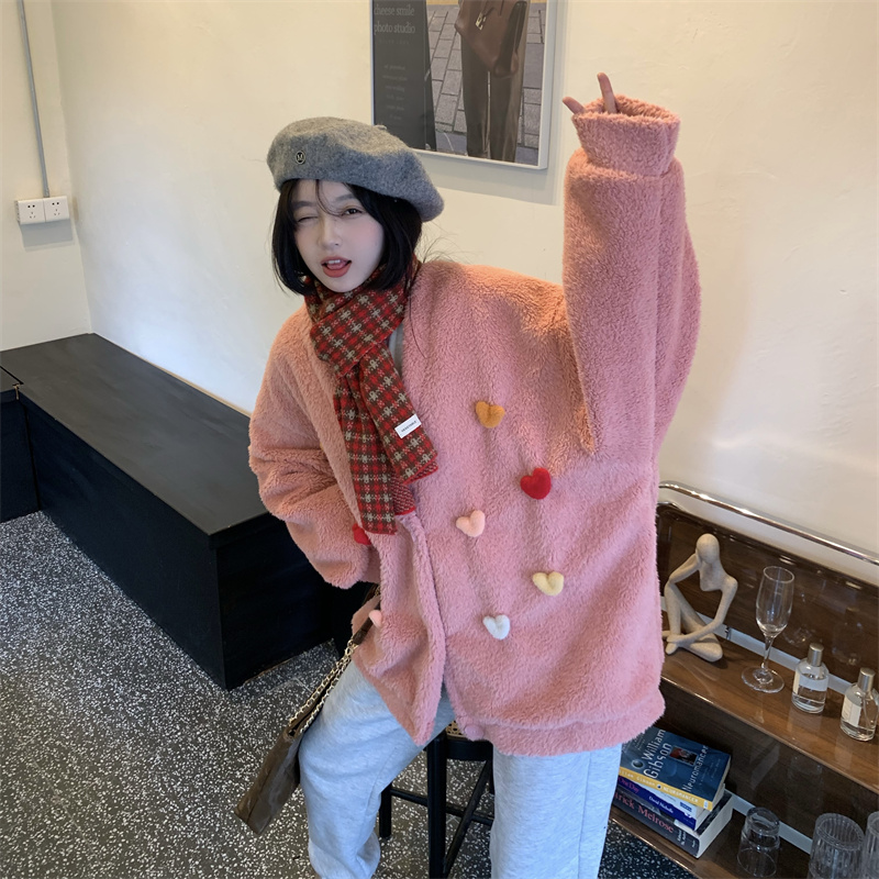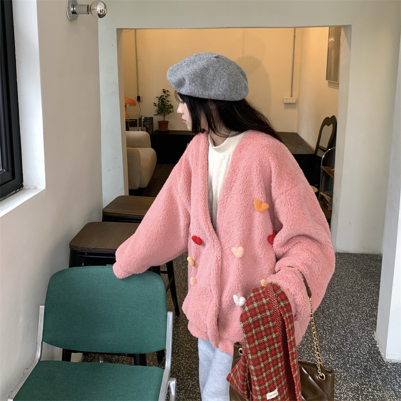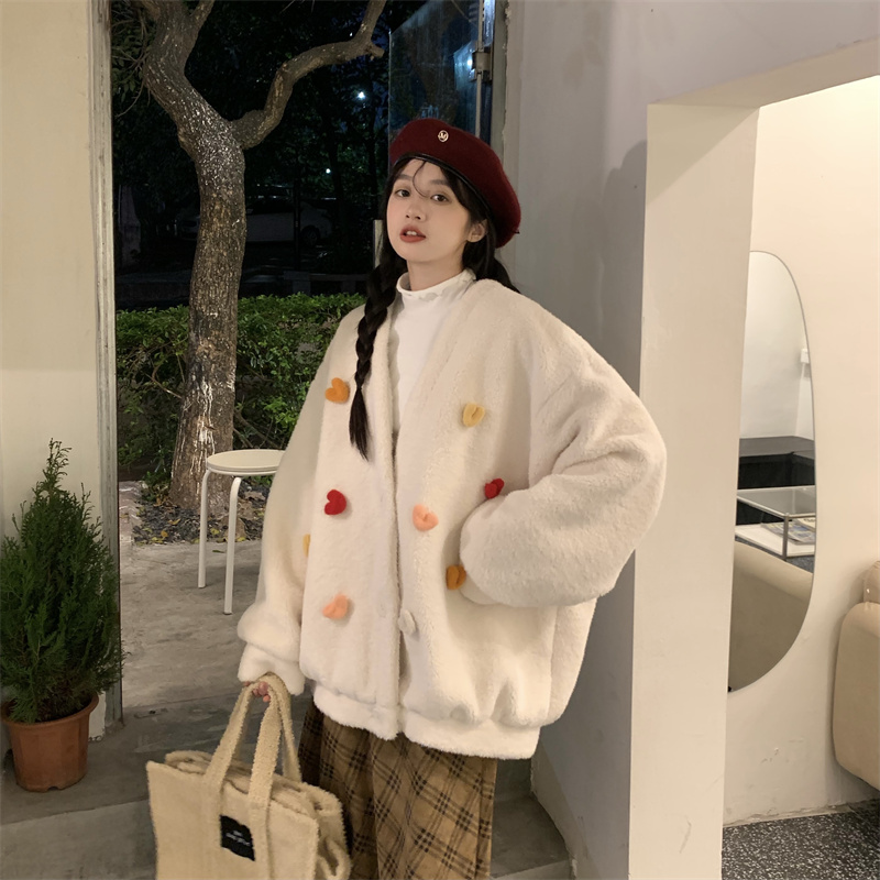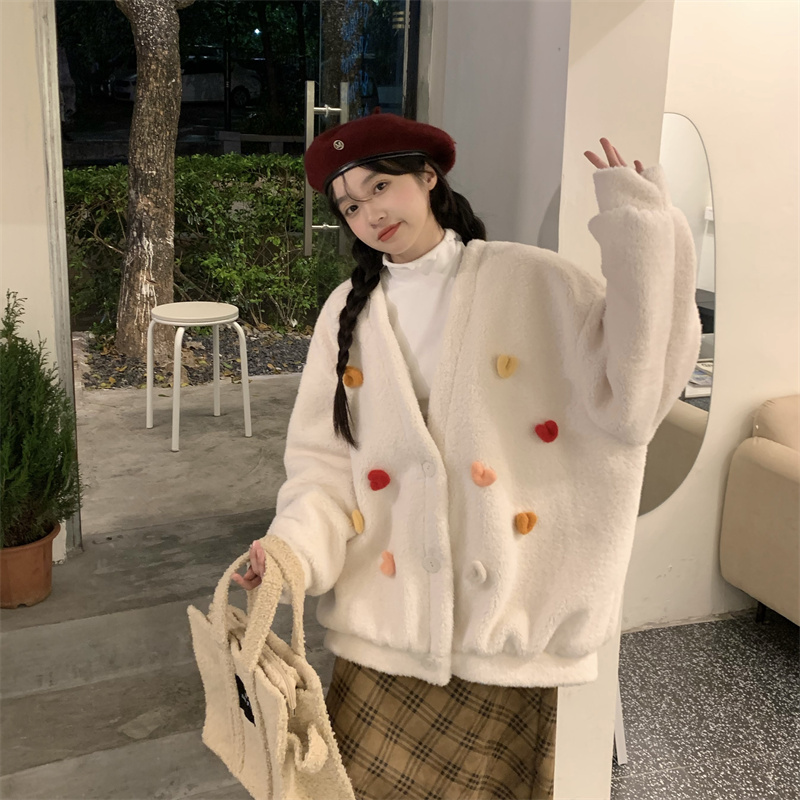 Temperament All-match Plush Thickened V-neck Top Lamb Wool Coat Women