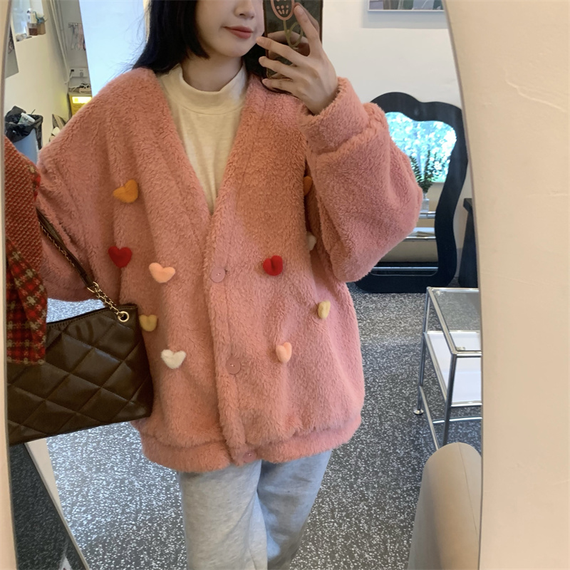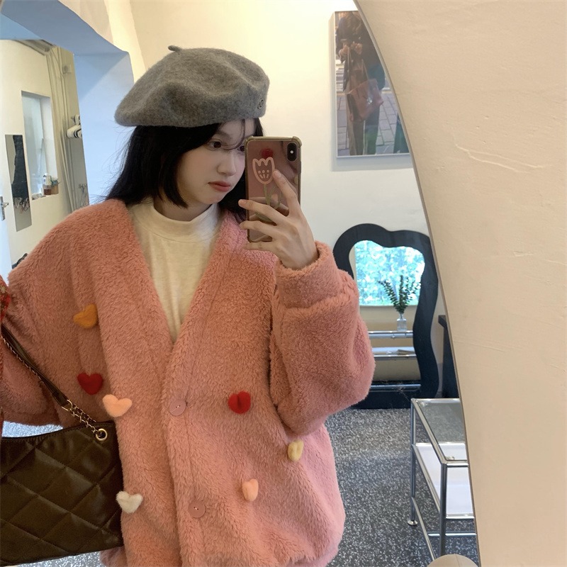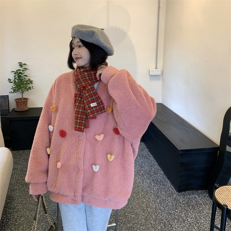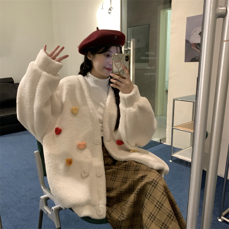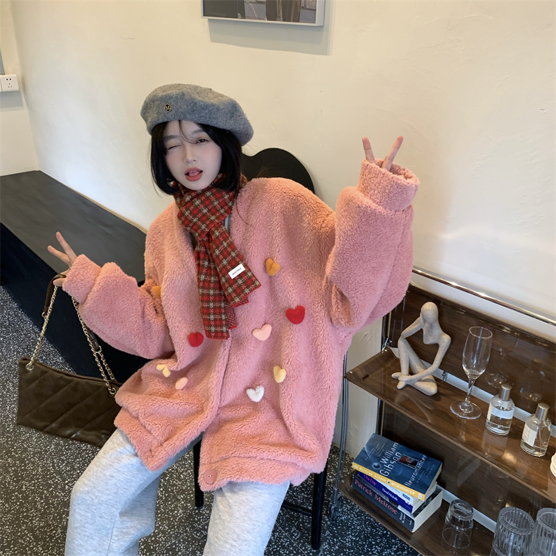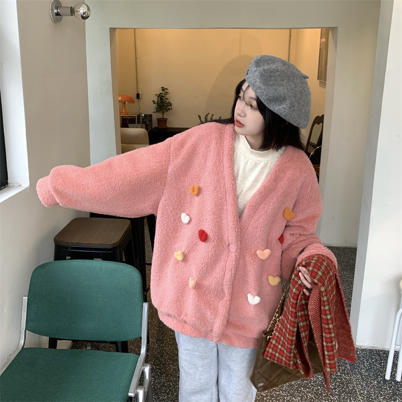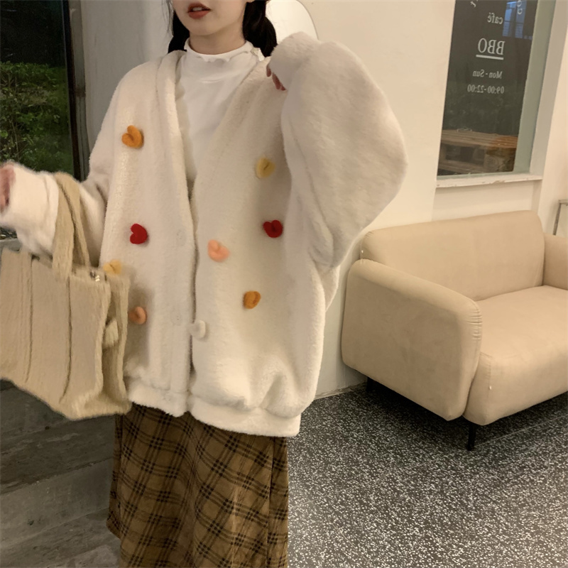 Temperament All-match Plush Thickened V-neck Top Lamb Wool Coat Women
