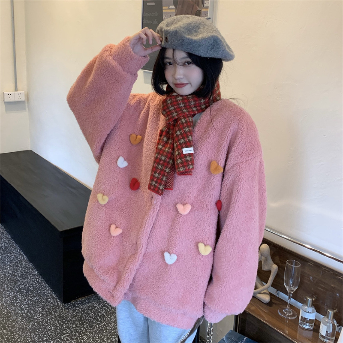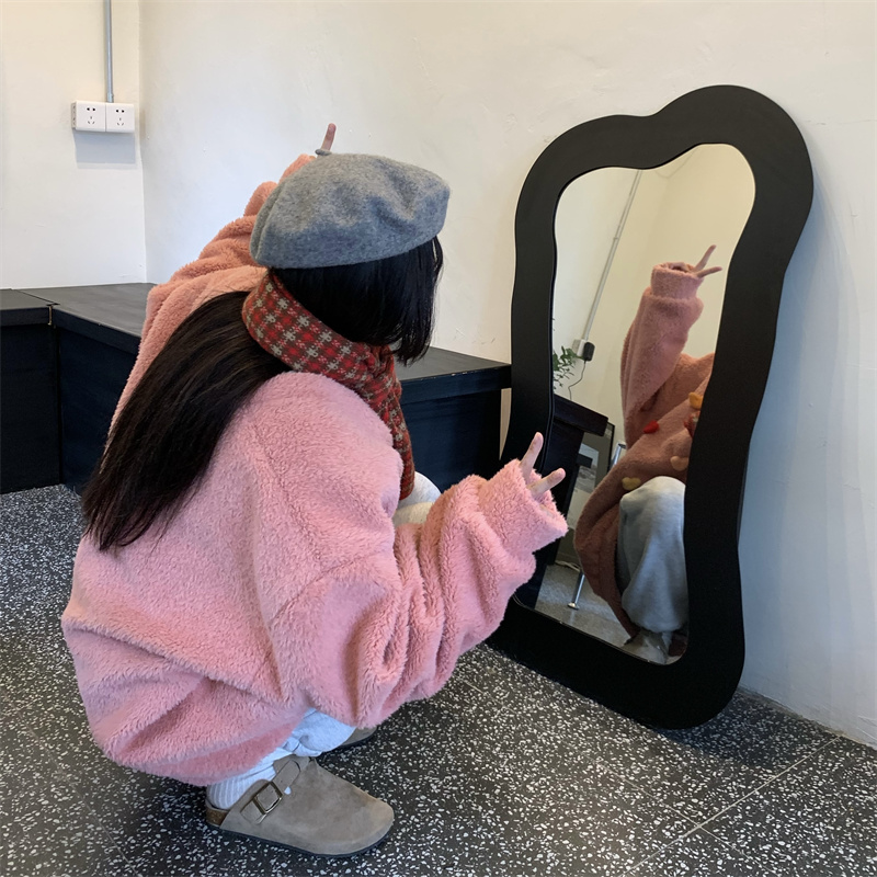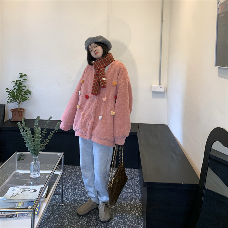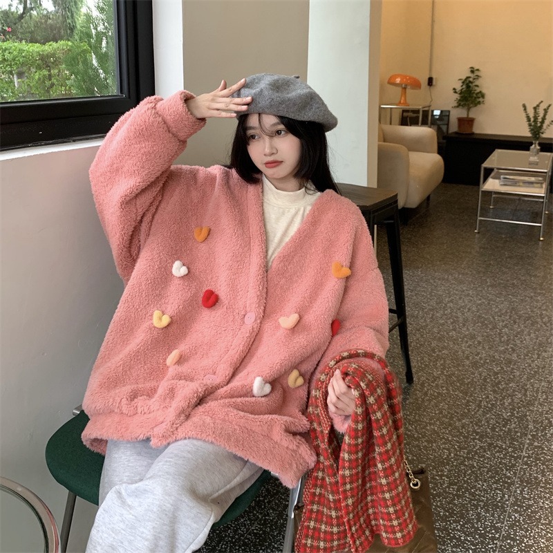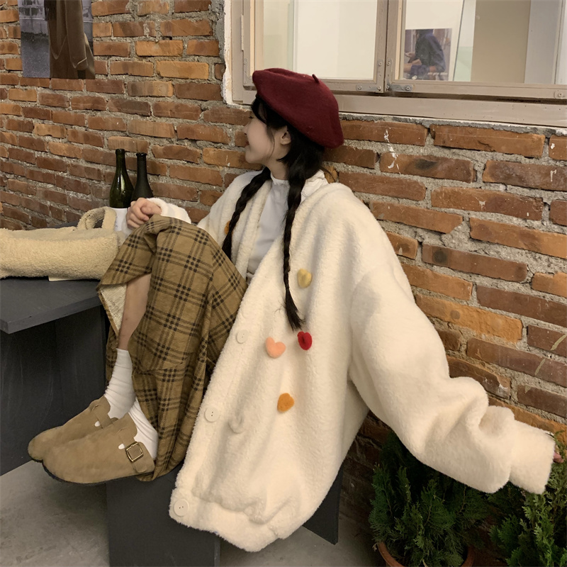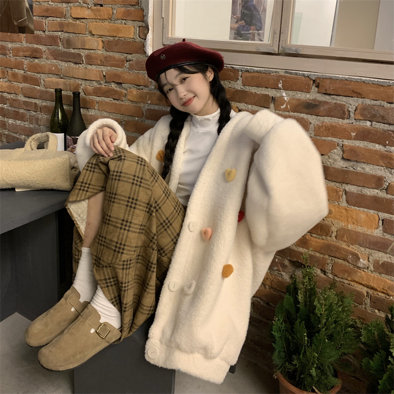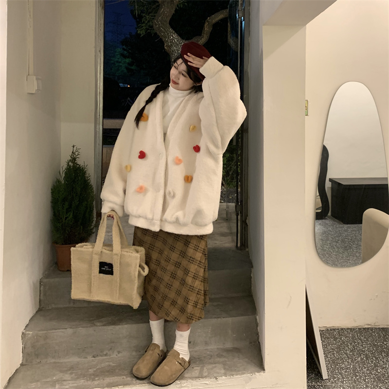 Temperament All-match Plush Thickened V-neck Top Lamb Wool Coat Women