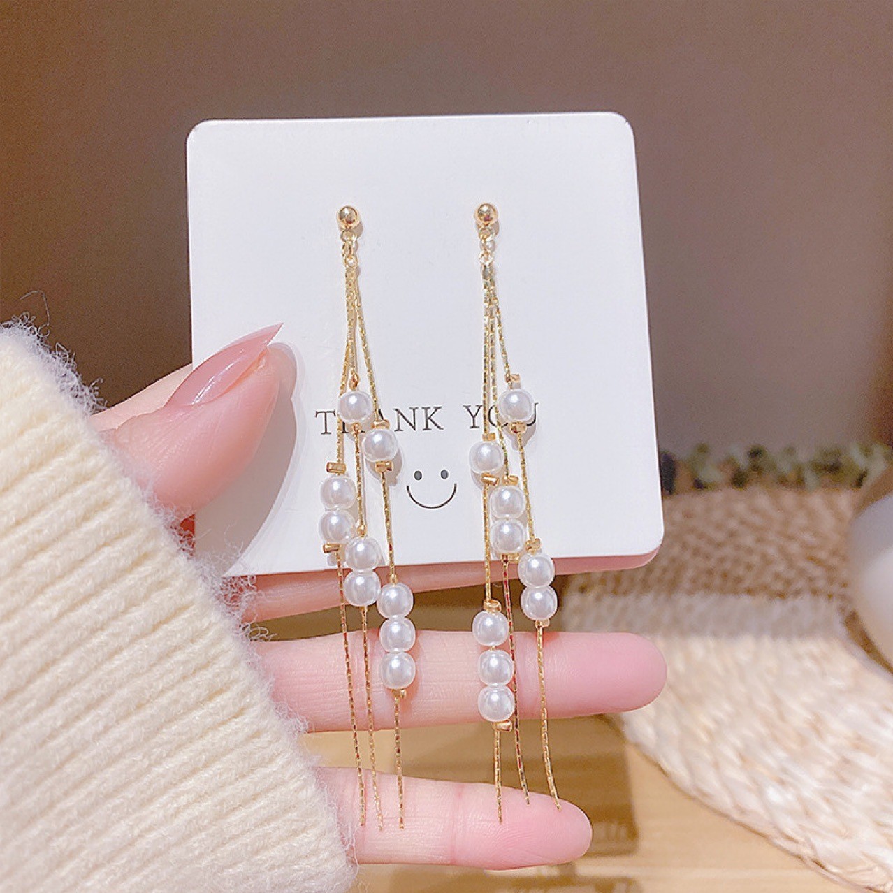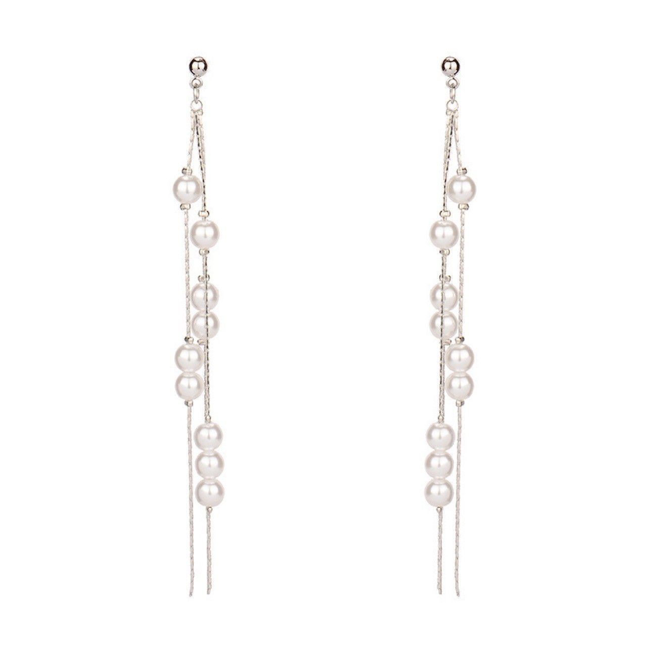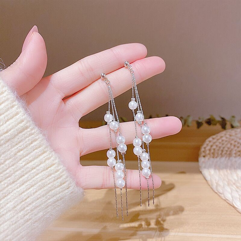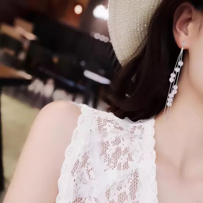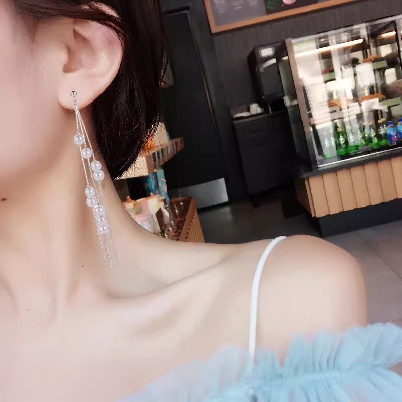 Temperamental Fairy Long Pearl Tassel Earrings High-grade Slimming