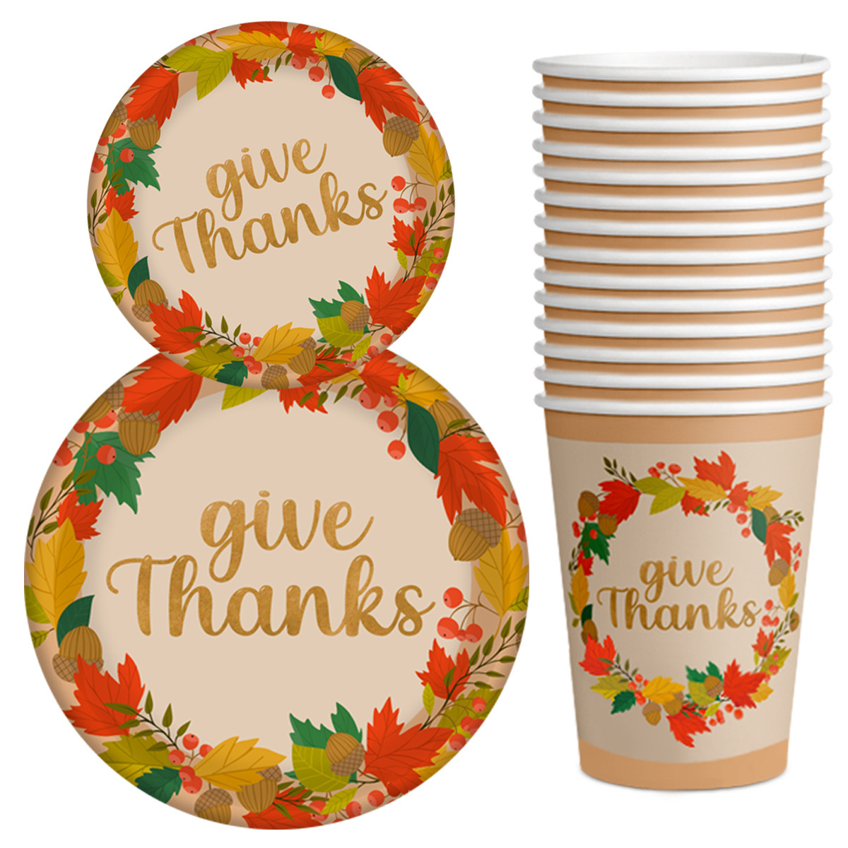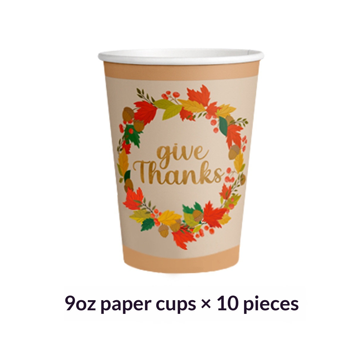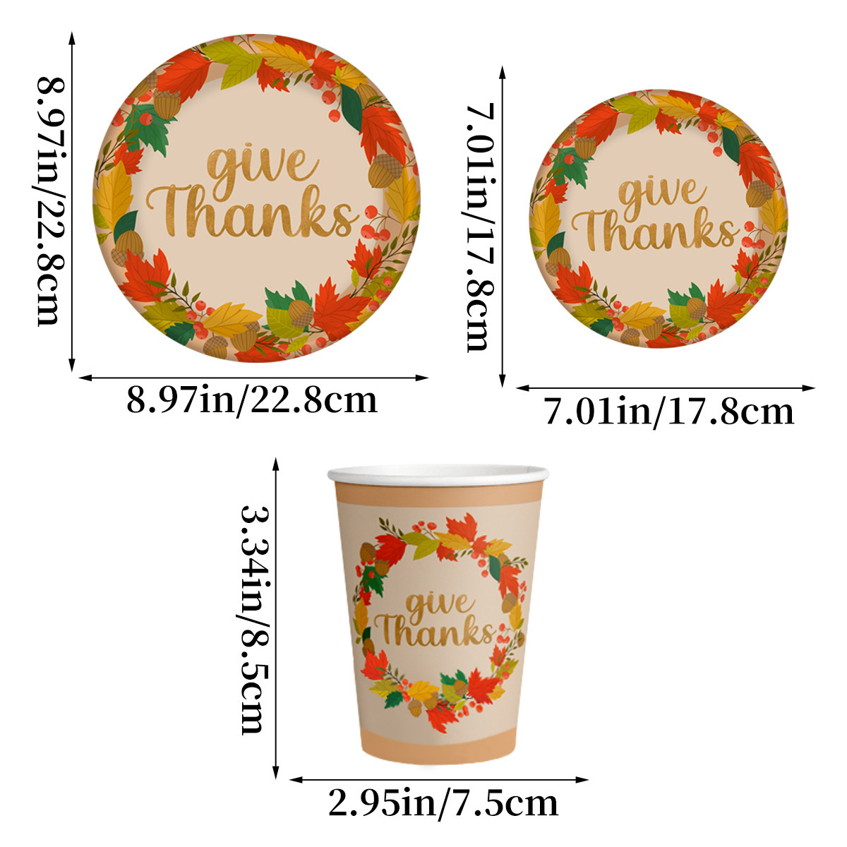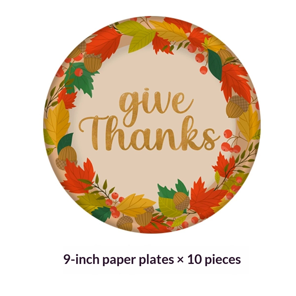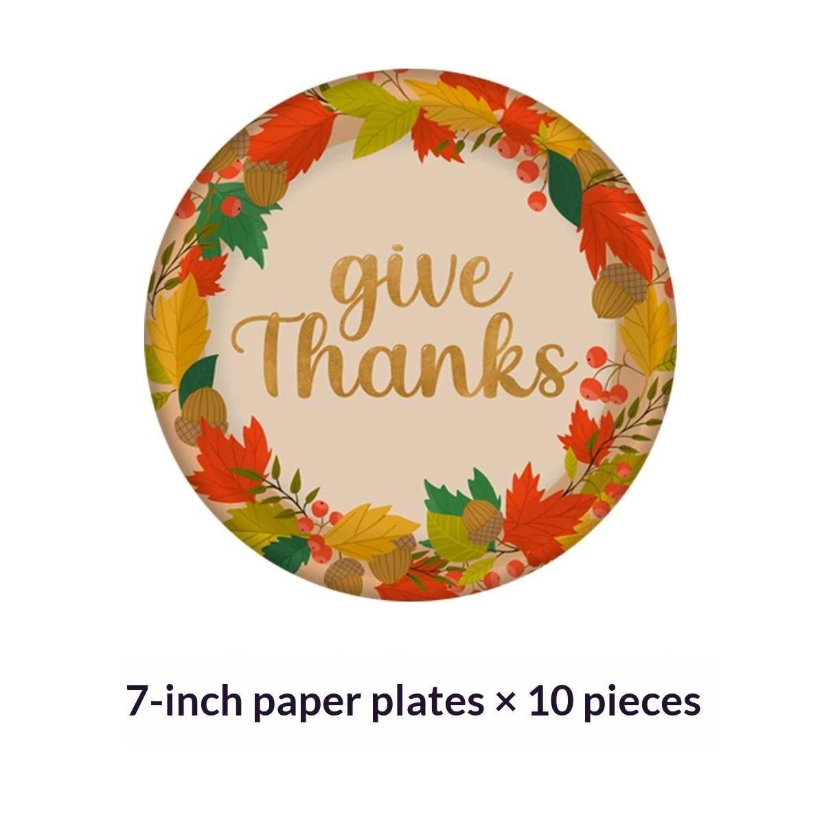 Color: 7-inch Thanksgiving paper plates (10pcs), 9-inch Thanksgiving paper plates (10pcs), Thanksgiving paper cups (10pcs), brown knife, brown fork, brown spoon