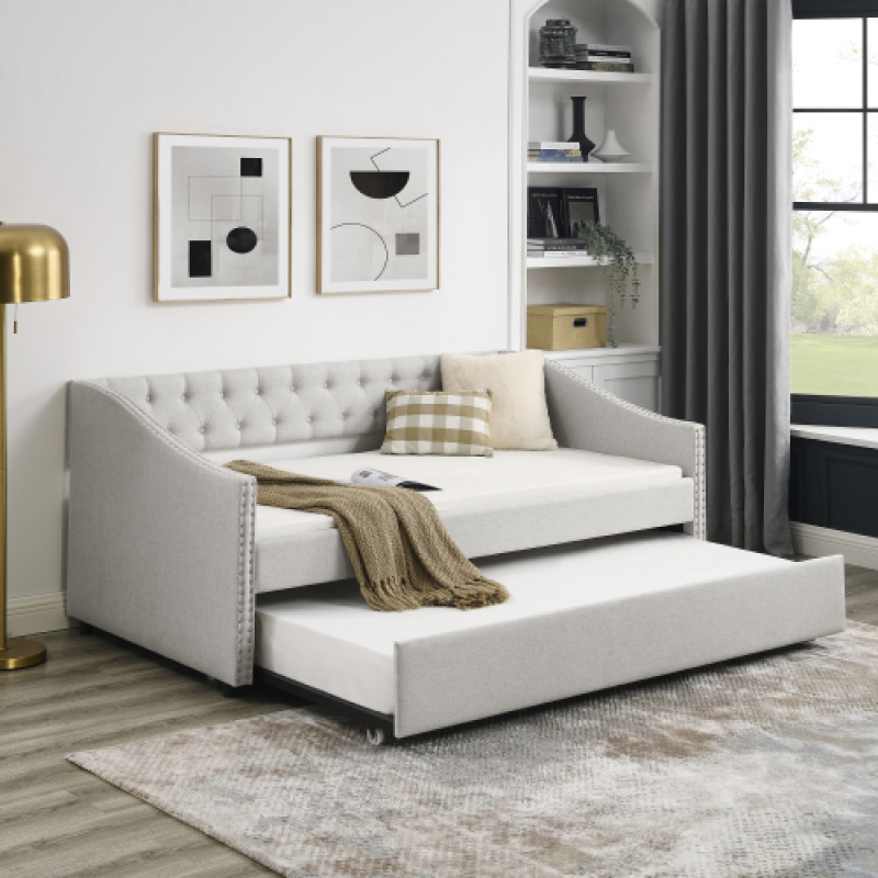 This mid-century style day bed features a button-quilted back for an elegant look. The wavy temples trimmed with the spike head combine chic details with classic style. This sofa bed adds a sophisticated touch to your home.