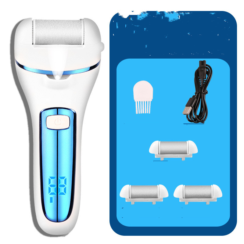 A foot grinder body, a USB charging cable, a cleaning brush, a coarse sanding head, a medium sanding head, a fine sanding head, a manual