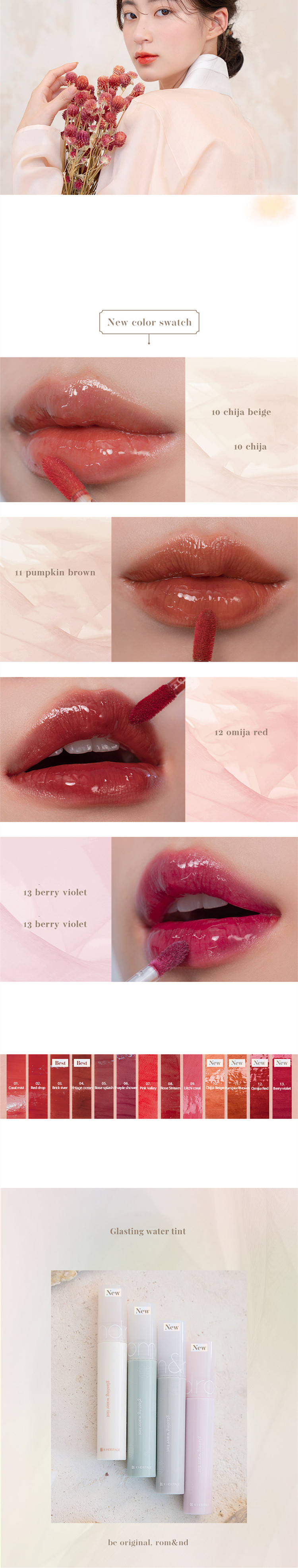 10#CHIJA BEIGE Gardenia Light Orange (Water Film), 11#PUMPKIM BROWN Pumpkin Brown (Water Film), 12 OMIJA RED Schisandra Red (Water Film), 13#BERRY VIOLET Red Purple Berries (Water Film), 07#ONION BEIGE Pale vermilion orange (matte), 08#FLOWER CORAL (matte), 09#MAPLE RED (matte), 10#BLUSH PURPLE (matte)