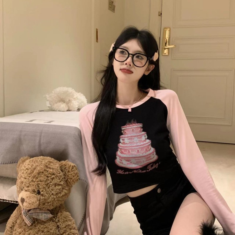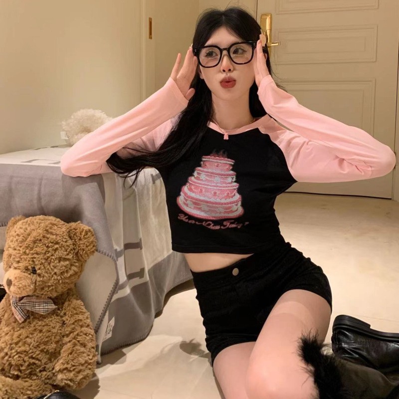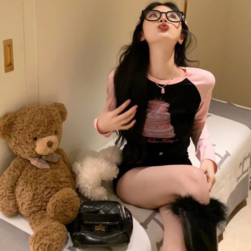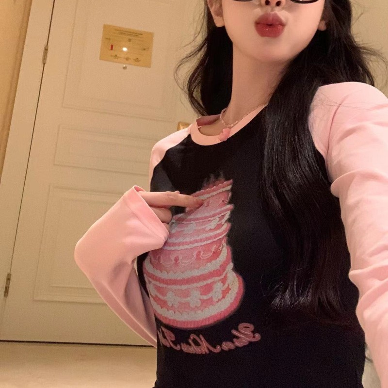 The New Spicy Fashion Slim Thin Short Round Neck Collar Collision Print Long-sleeved T-shirt