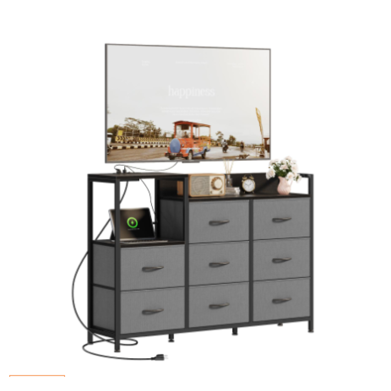 Large-capacity layered storage: 8 soft-closing fabric drawers + 1 open bookshelf, categorizing and storing media accessories, games, books, etc. Say goodbye to the clutter in the living room and make storage more organized