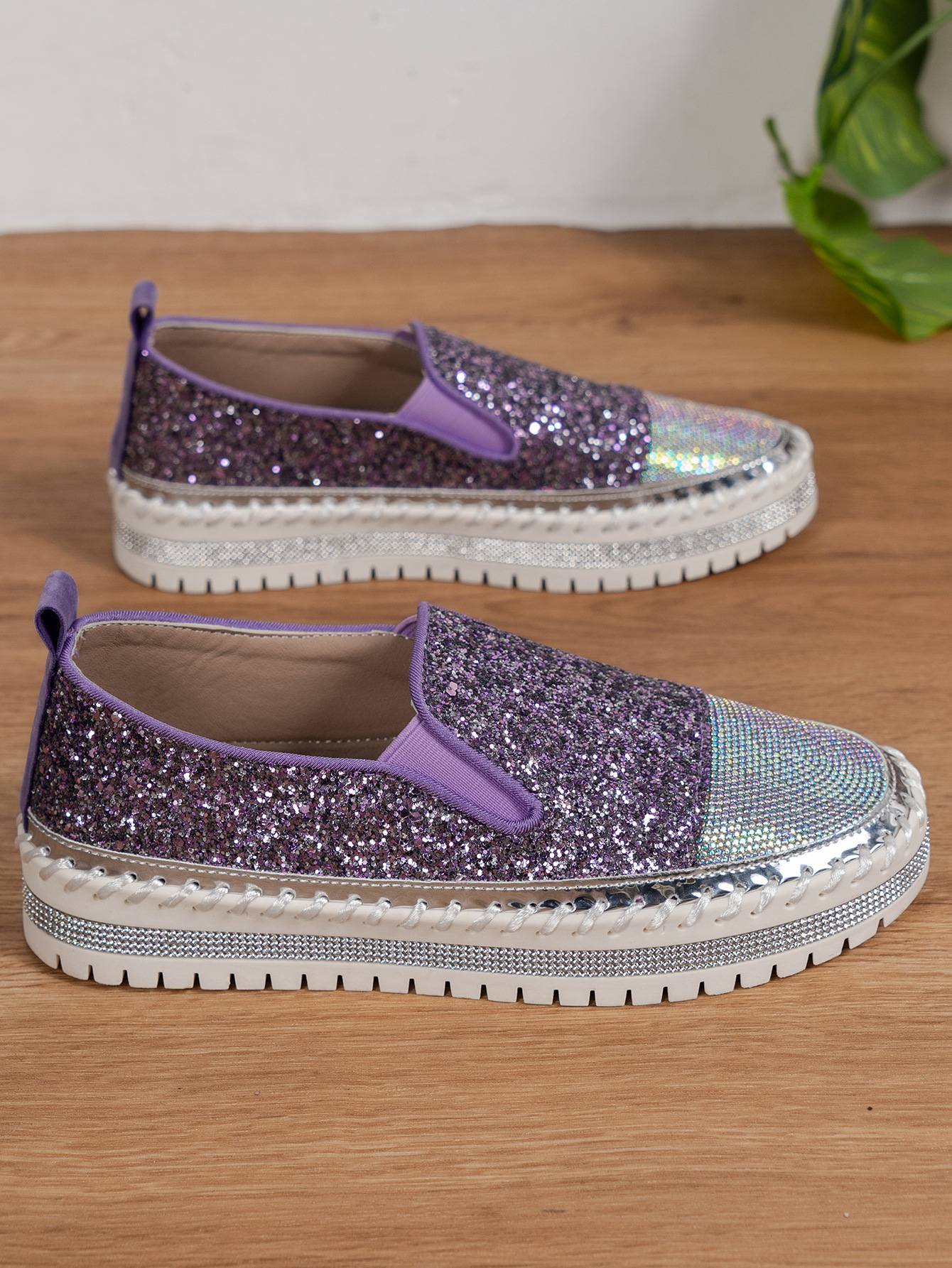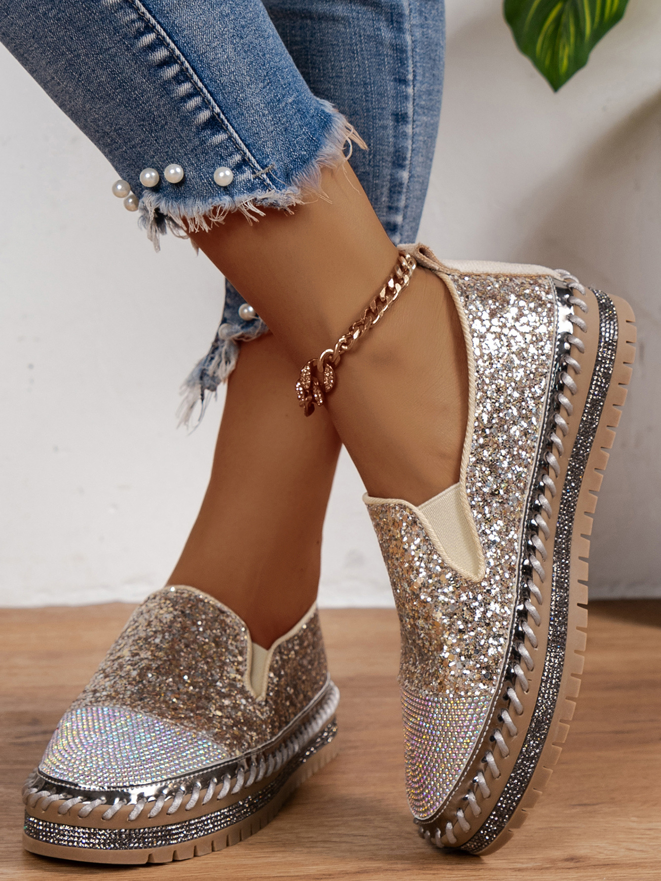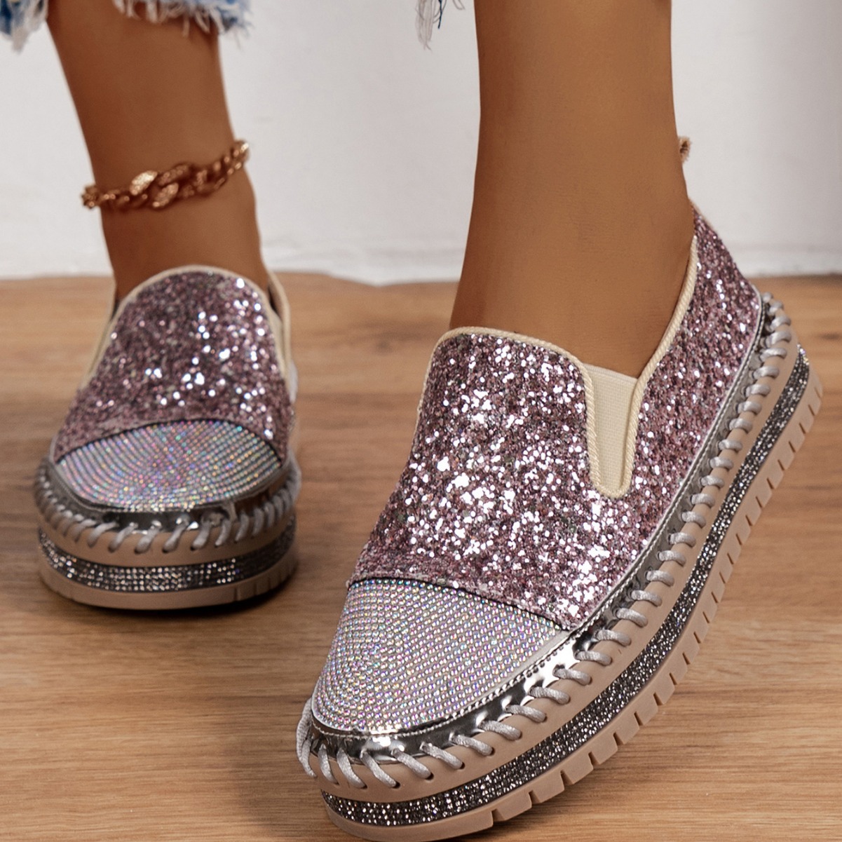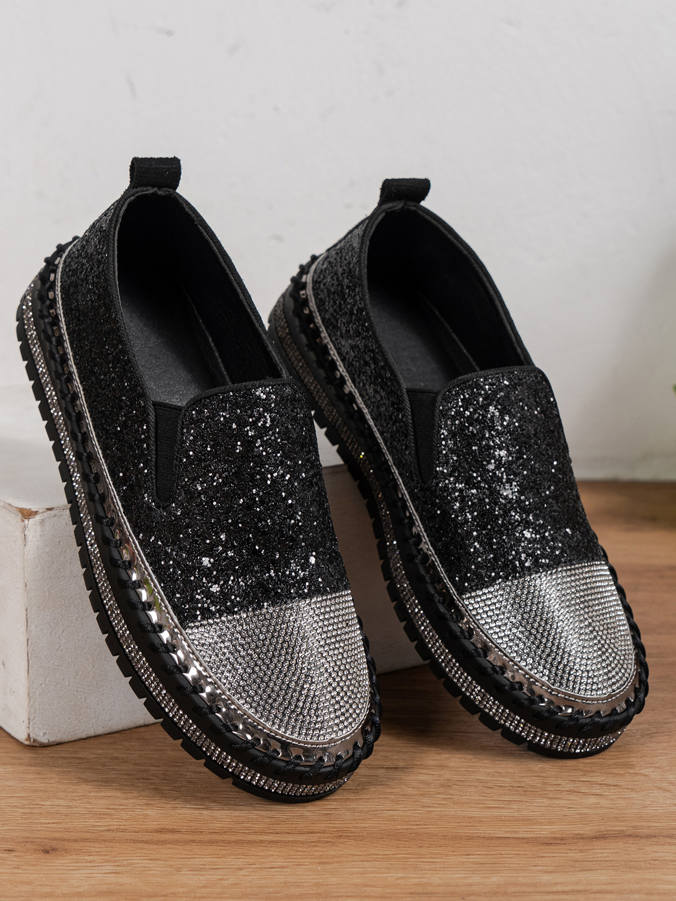 Thick Bottom Flat Loafers Rhinestone