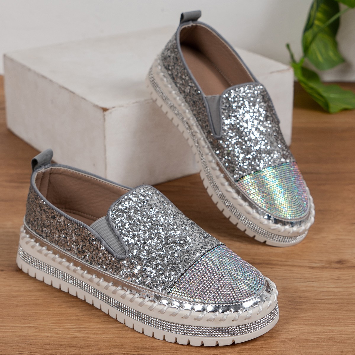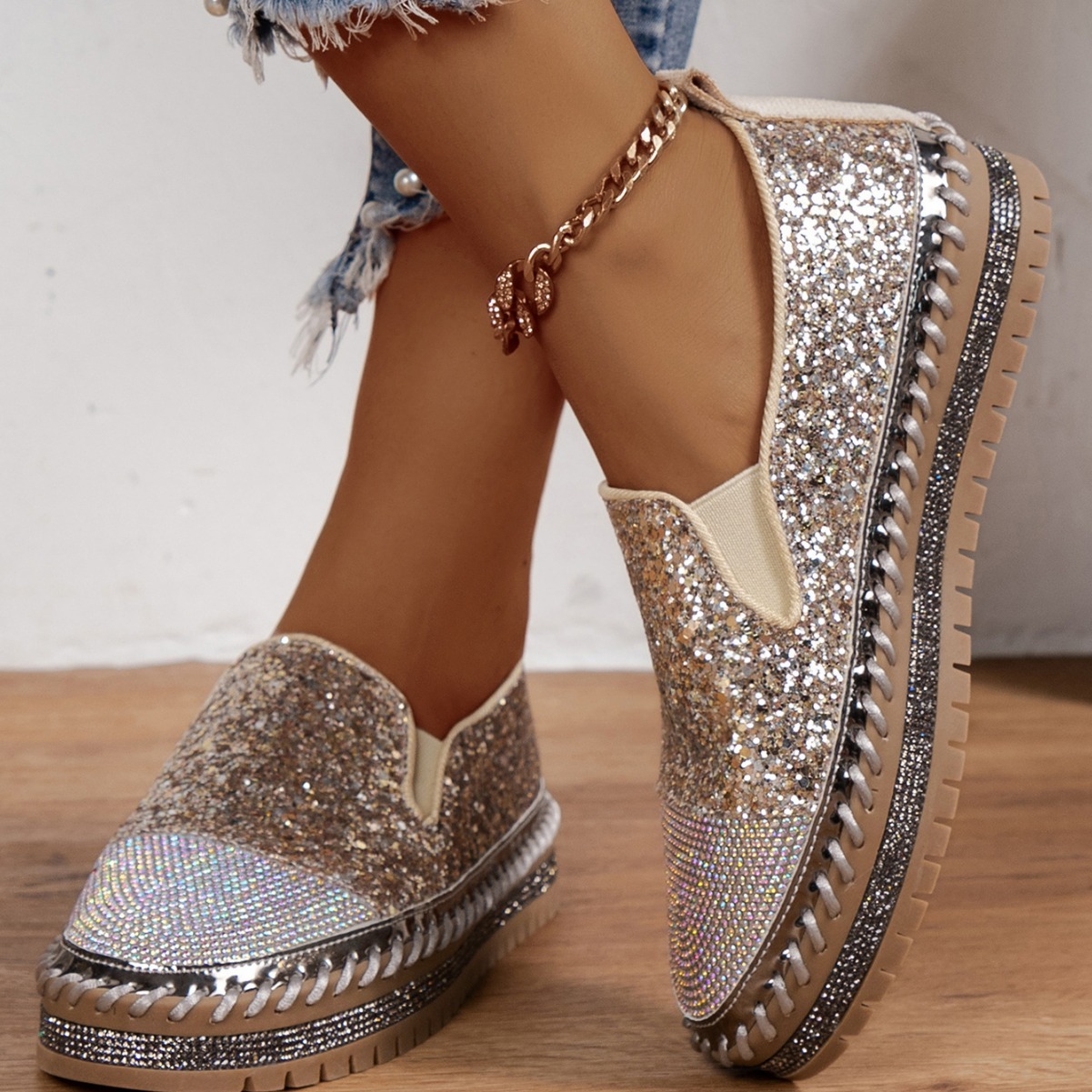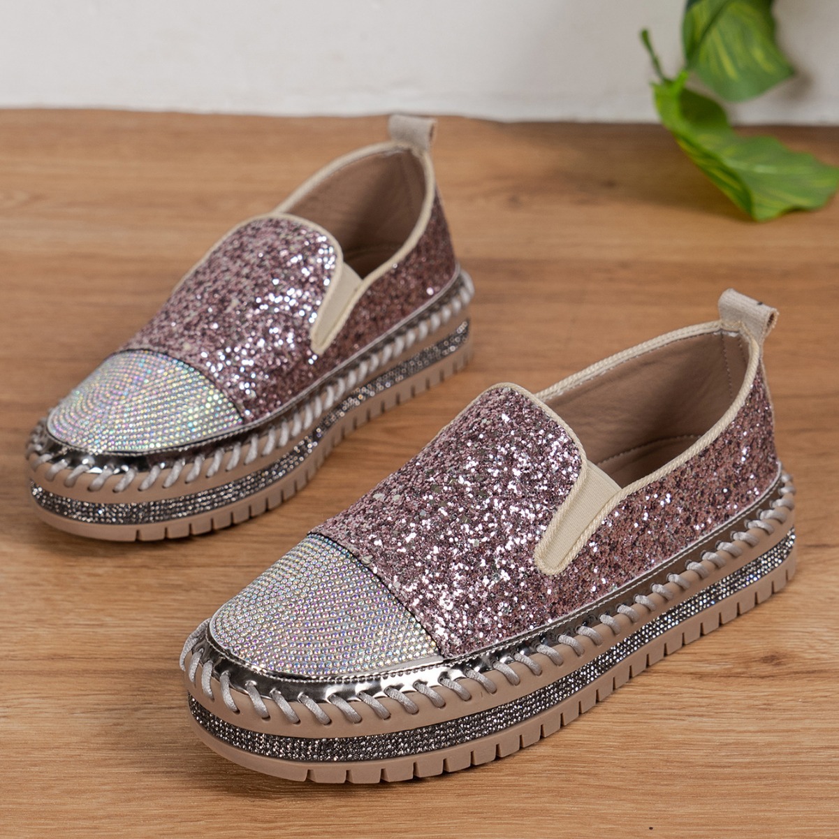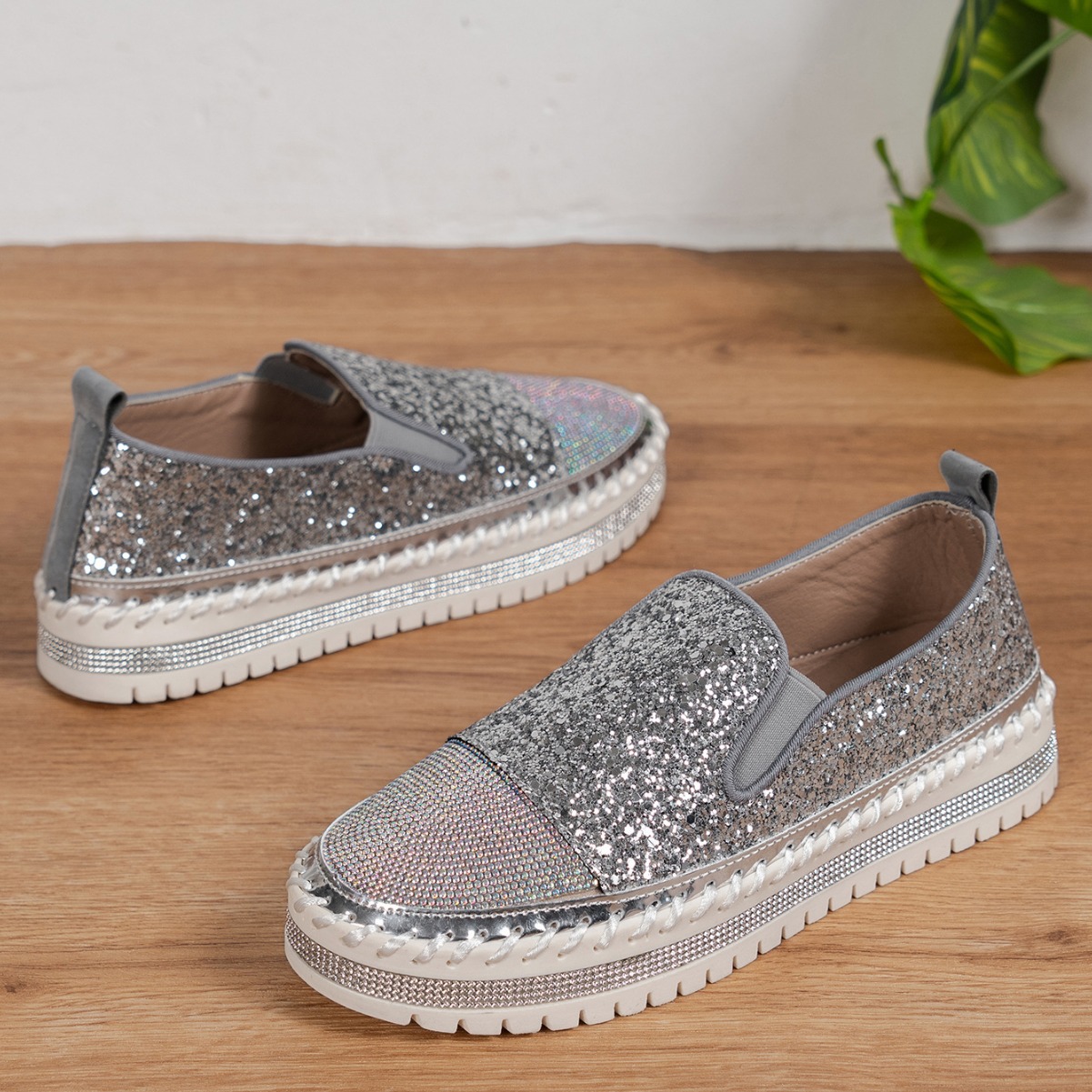Thick Bottom Flat Loafers Rhinestone