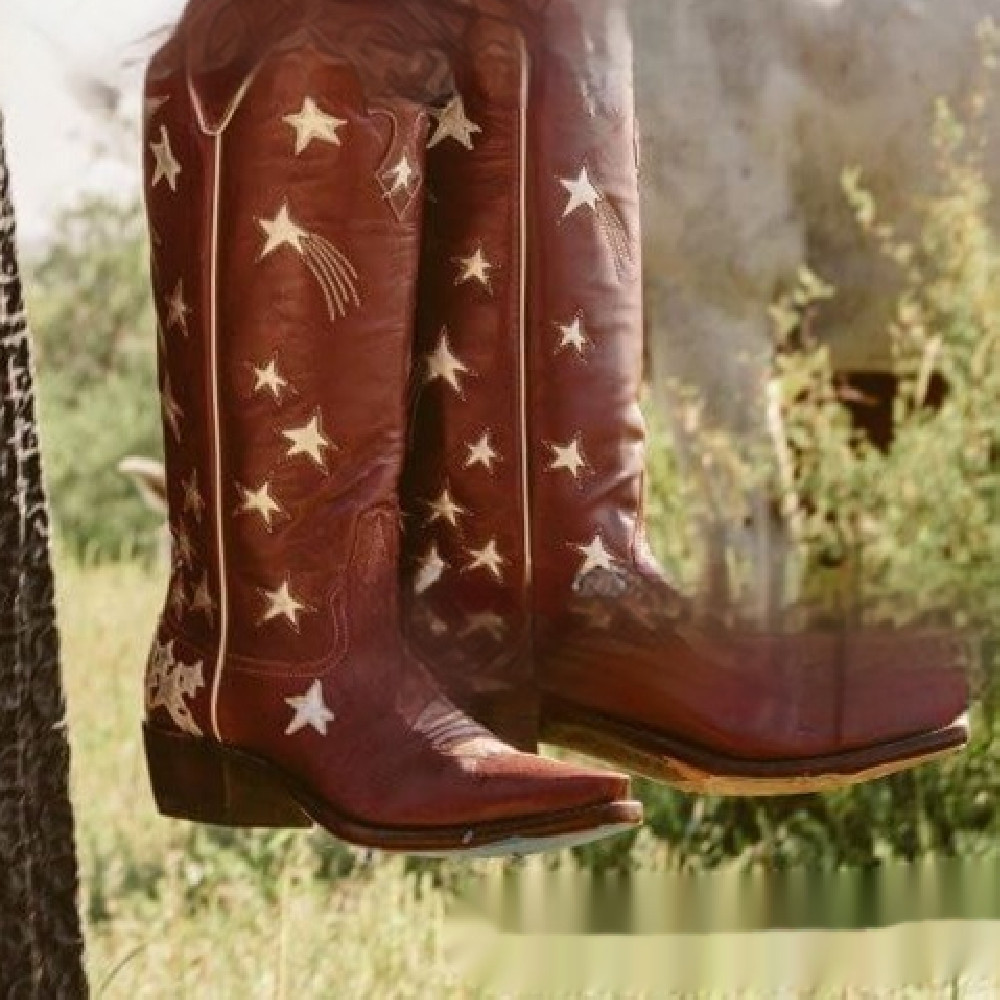 Thick Mid Heel Sleeve Western Star Moon Leather High Leg Boot