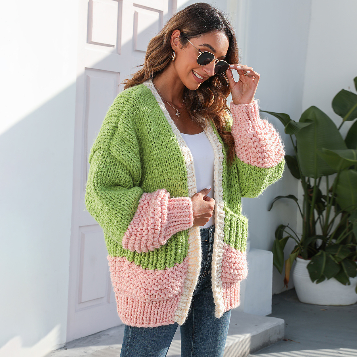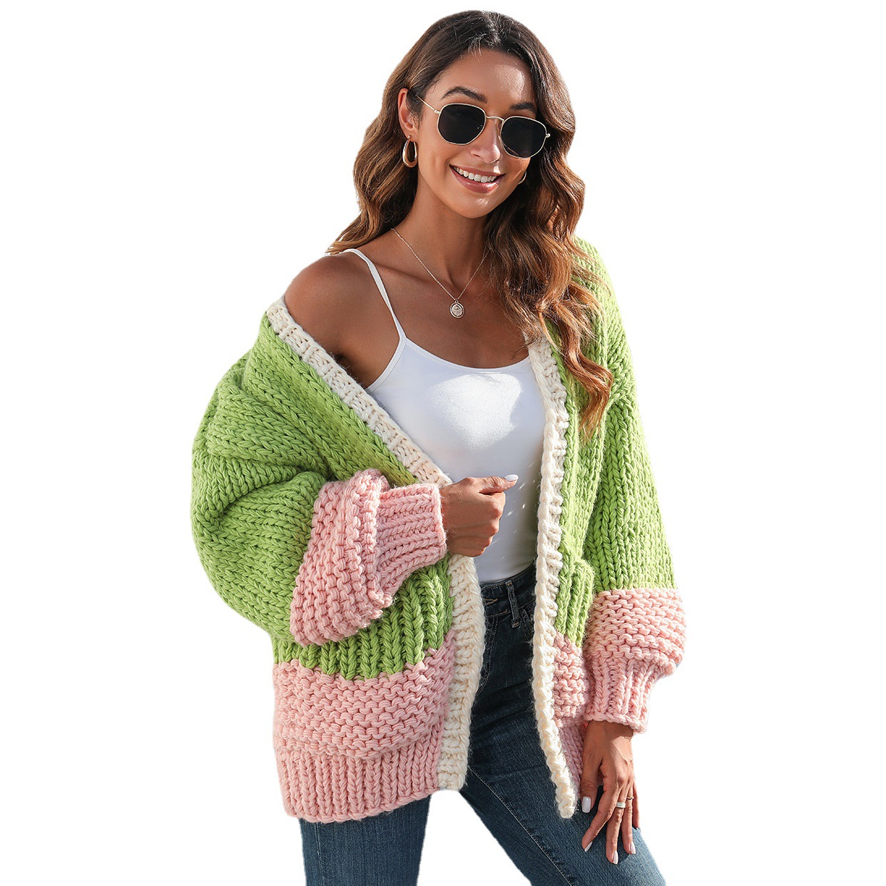 Thick Sweater Idle Style Contrast Color Knitted Cardigan For Women