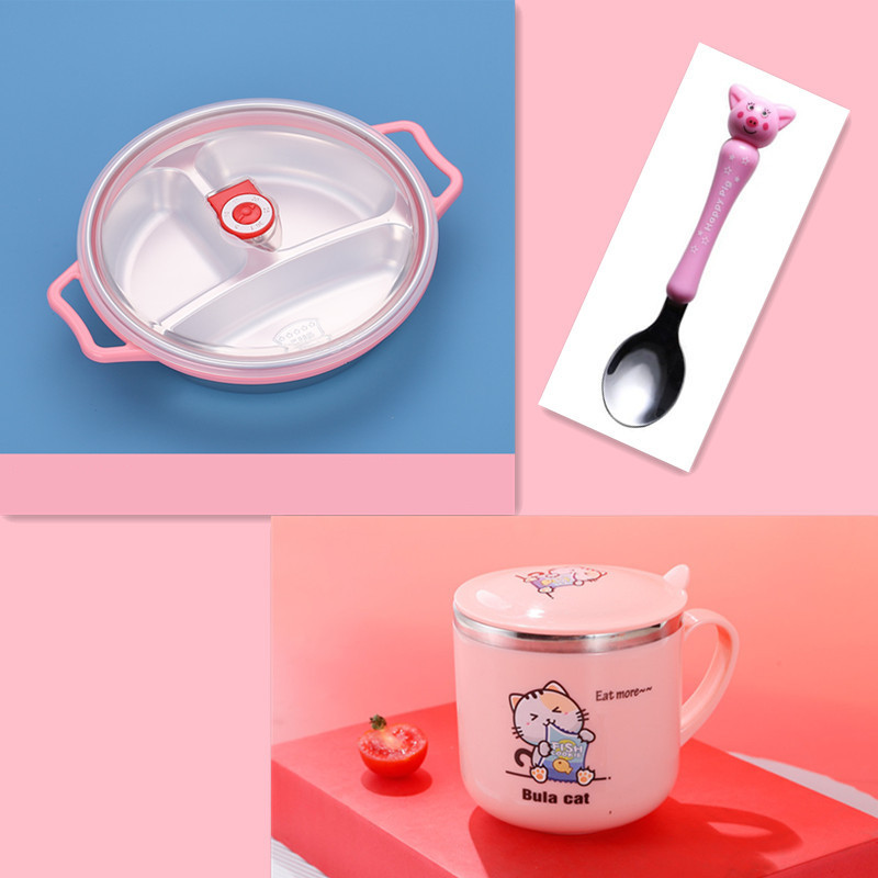 Style 19: 304 Pink Handle Dinner Plate with Lid + Cat Cup Pink Pig Spoon