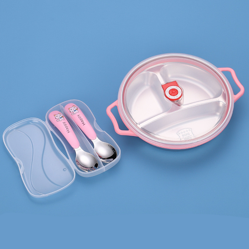 13 style: 304 pink handle dinner plate with lid + pink cat fork spoon