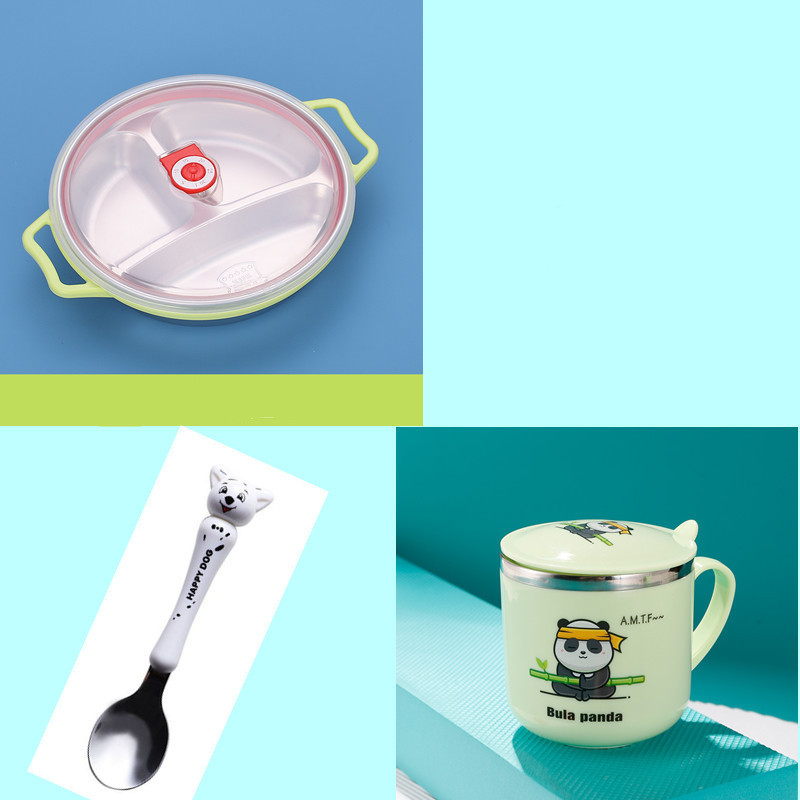 21 style: 304 green handle plate with lid + panda cup puppy spoon
