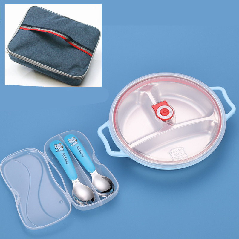 24 style: 304 blue handle plate with lid + medium insulation bag blue cat fork and spoon