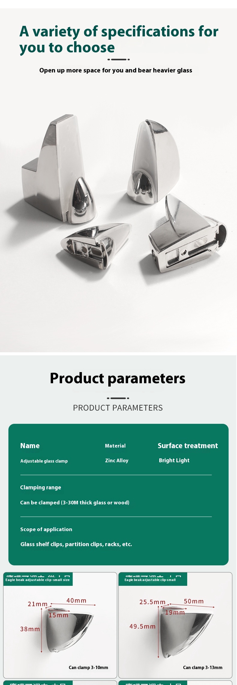 Specifications: olecranon adjustable clip-miniature, olecranon adjustable clip-small, olecranon adjustable clip-medium, olecranon adjustable clip-large, Fish Mouth adjustable clip-small, Fish Mouth adjustable clip-medium, fish Mouth adjustable clip-large