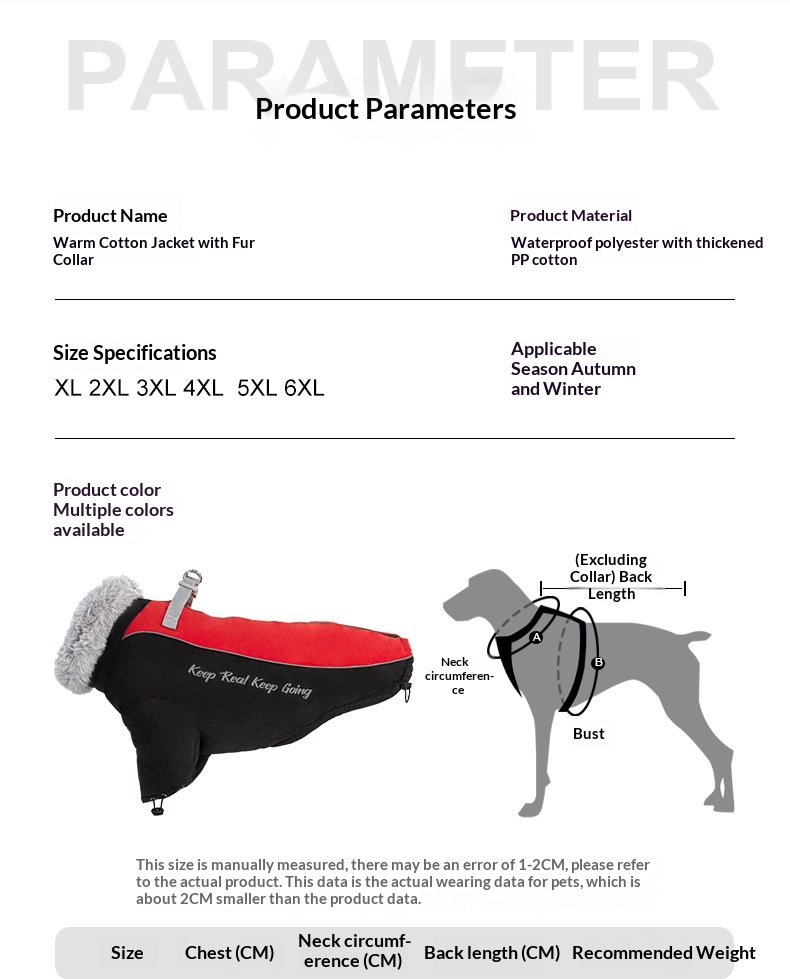 Sizes: XL (7.5-11.5 kg) Chest circumference 60 cm, back length 39 cm; 2XL (11.5-15 kg) Chest circumference 64 cm, back length 44 cm; 3XL (15-20 kg) Chest circumference 70 cm, back length 48 cm; 4XL (20-30 kg) Chest circumference 76 cm, back length 53 cm; 5XL (30-40 kg) Chest circumference 82 cm, back length 59 cm; 6XL (40-47.5 kg) Chest circumference 91 cm, back length 69 cm