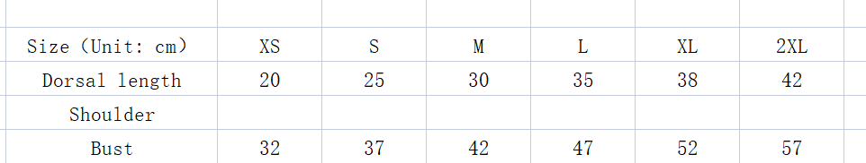 Size: XS (suggested weight 1-3 kg), S (suggested weight 3-5 kg), M (suggested weight 5-8 kg), L (suggested weight 8-11 kg), XL (suggested weight 11-15 kg), XXL (suggested weight 15-20 kg).