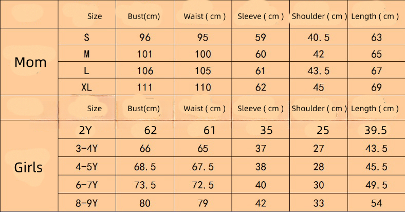 Suitable height: S for Mother, Mother M, mom size L, mother XL, girl 2Y, girl 3-4Y, girl 4-5Y, girl 6-7Y, girl 8-9Y