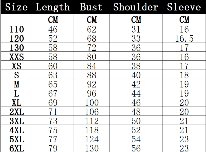 Size: XXS, XS, S, M, L, XL, XXL, 3XL, 4XL, 5XL, 6XL, 110, 120, 130