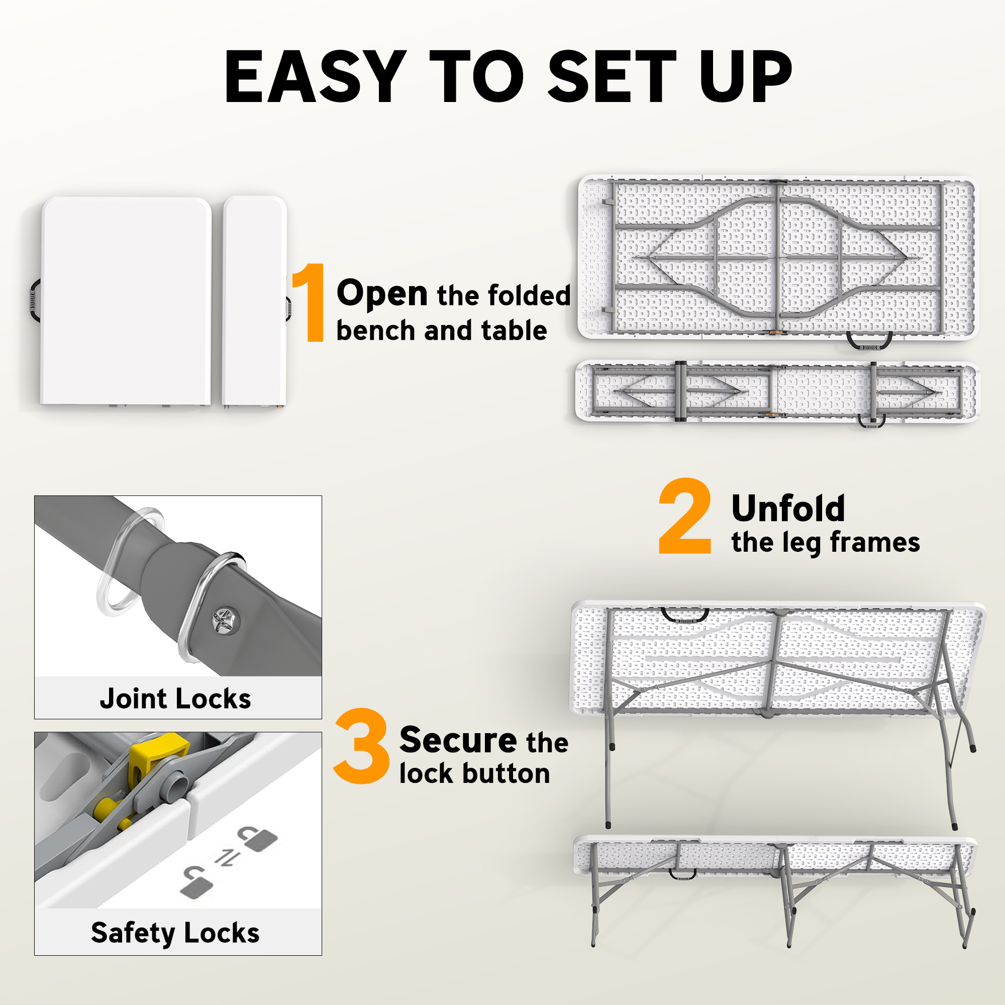 Unfold and go for adventures outdoors, with this three-piece picnic set. Comes with a folding table and two two-seater benches - simply undo and start sitting; the built-in handles make this set easy to carry around. The powder coated metal frames are strong and supportive, with joint locks to safely secure in place.