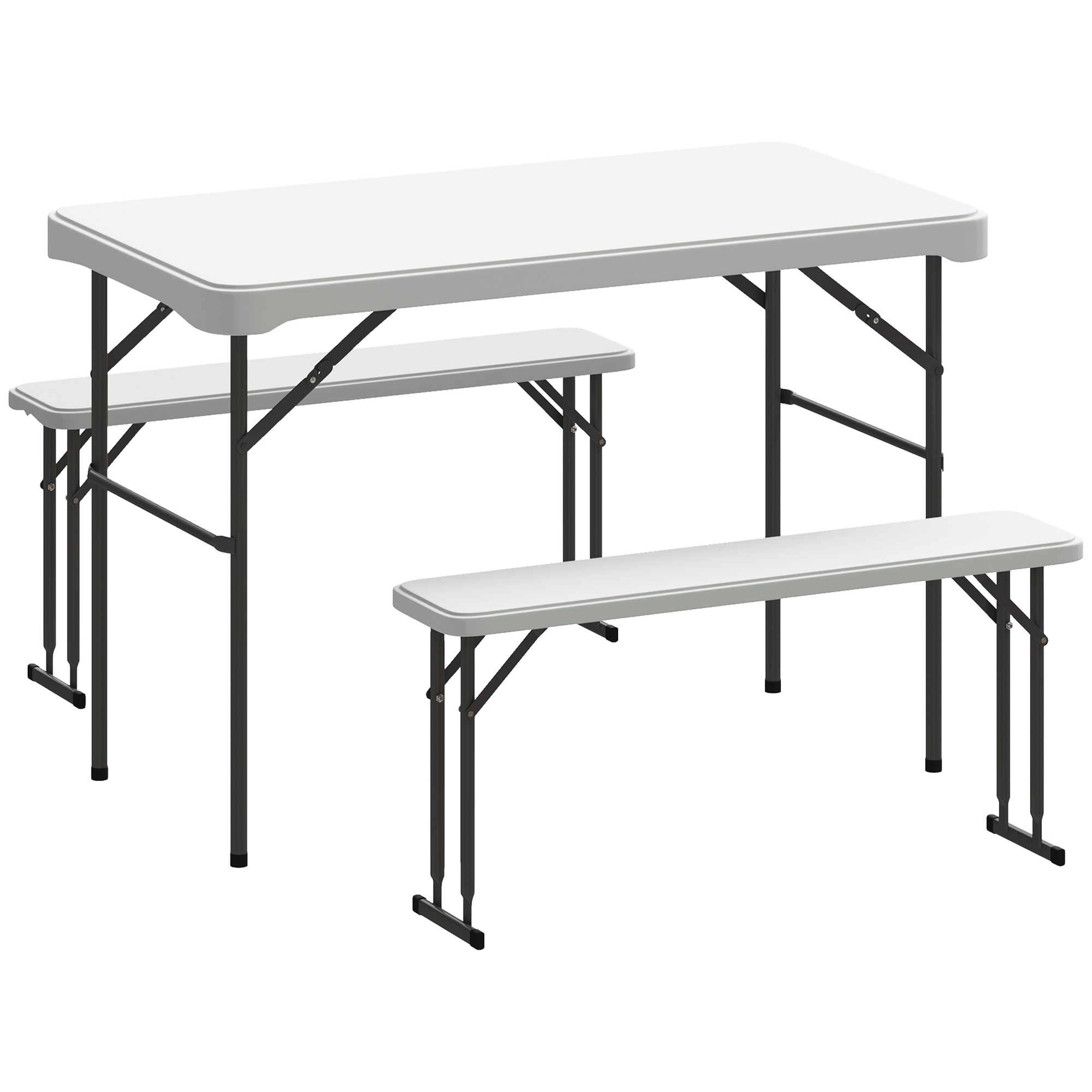 This three-piece set comes with a foldable table and two benches - this is the set for you to bring to camping trips, picnics or festival outings. Each piece has a metal frame for a strong and supportive core, fitted with tough HDPE plastic tabletops. Simply fold up and fold out - with a handle to carry around easily.